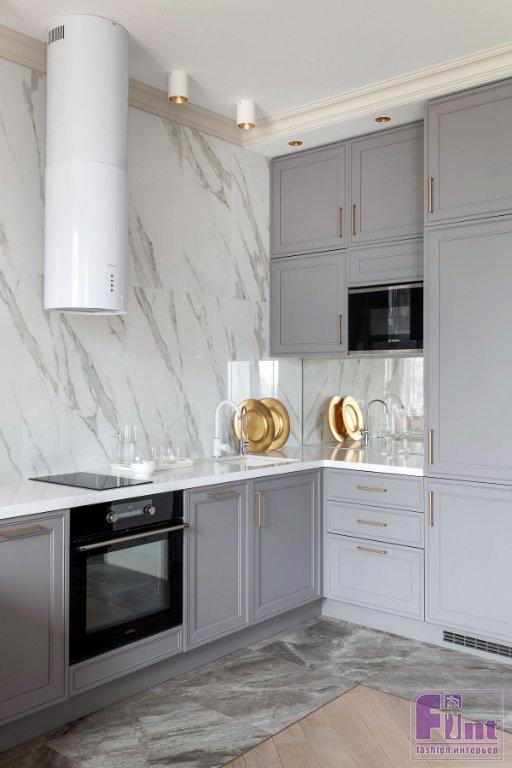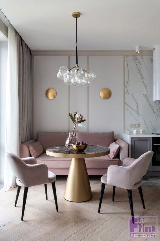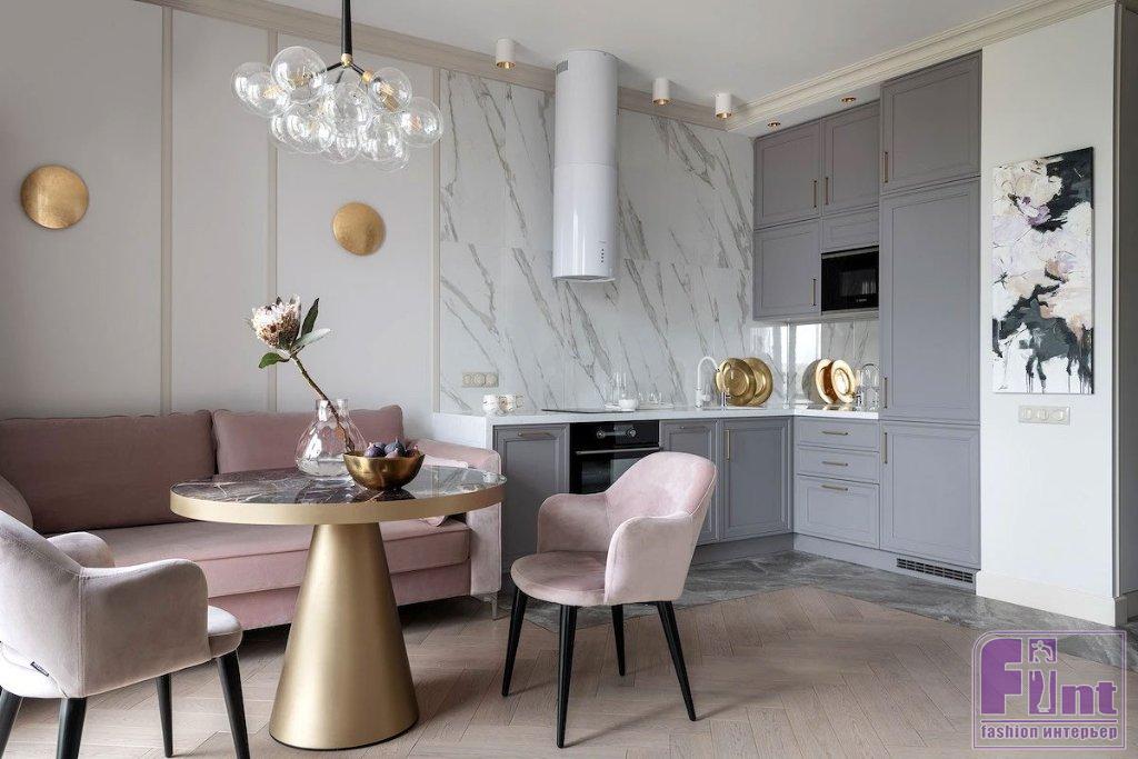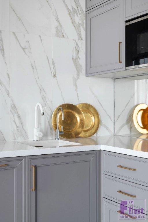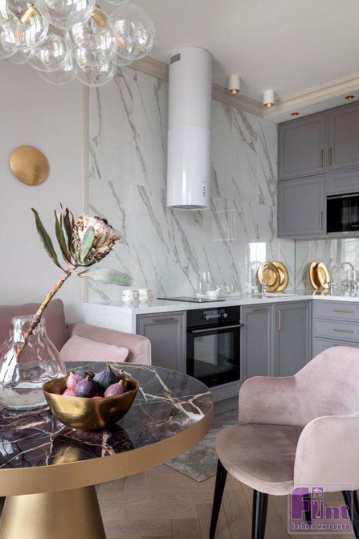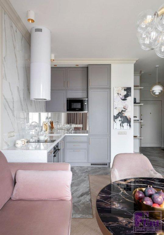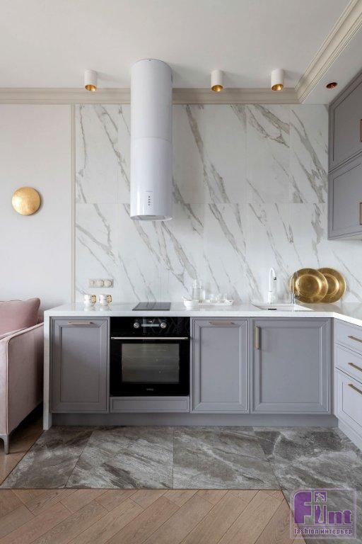 Для отделки основных зон выбрали краску и инженерную доску, уложенную английской ёлкой. В прихожей и у кухонного гарнитура — керамогранит, так практичнее. Стены украшают молдинги и зеркала, которые заходят на потолки, обрамлённые высокими карнизами. Лепнина выкрашена в бежевый цвет — контрастный к стенам, но не темный. Интересный дизайнерский приём, который добавляет ритма в интерьер. Кухонный фартук оформили крупноформатным керамогранитом под мрамор, а в зоне навесных шкафов — зеркальным полотном.