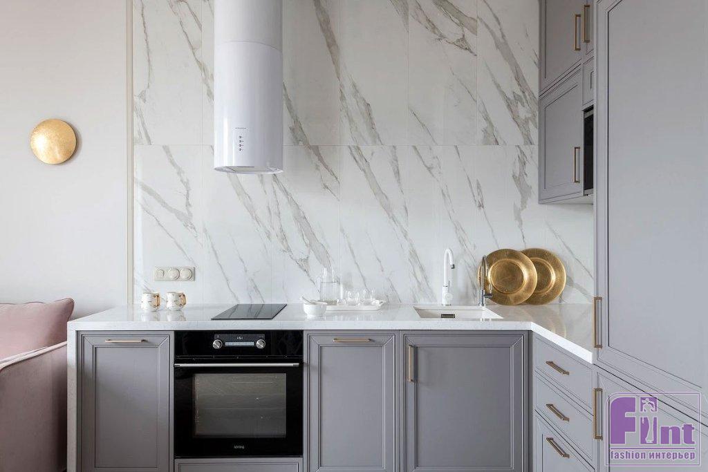 Кухонный гарнитур достаточно компактный. Нижние базы выстроены углом, верхние шкафы — только по одной стене, вторая же подчеркнута эффектным фартуком и цилиндрической вытяжкой потолочного крепления.