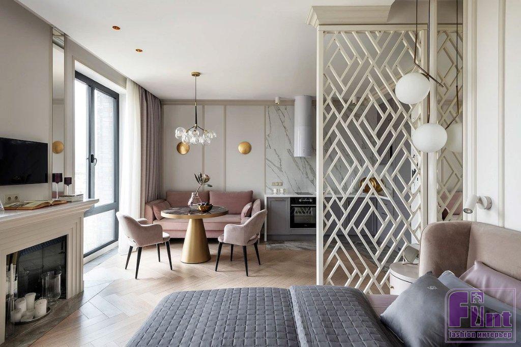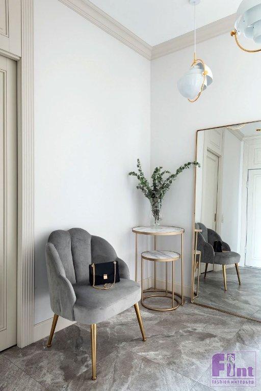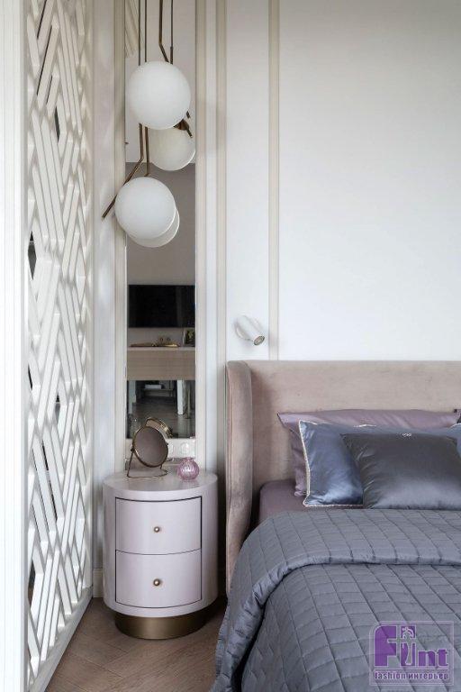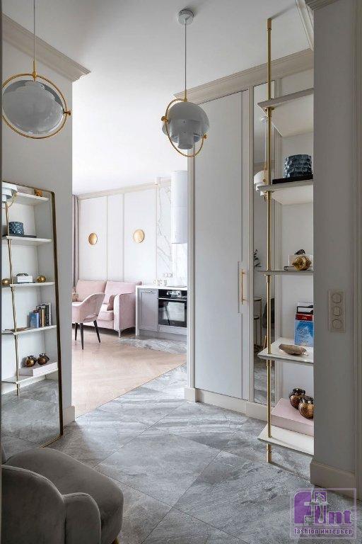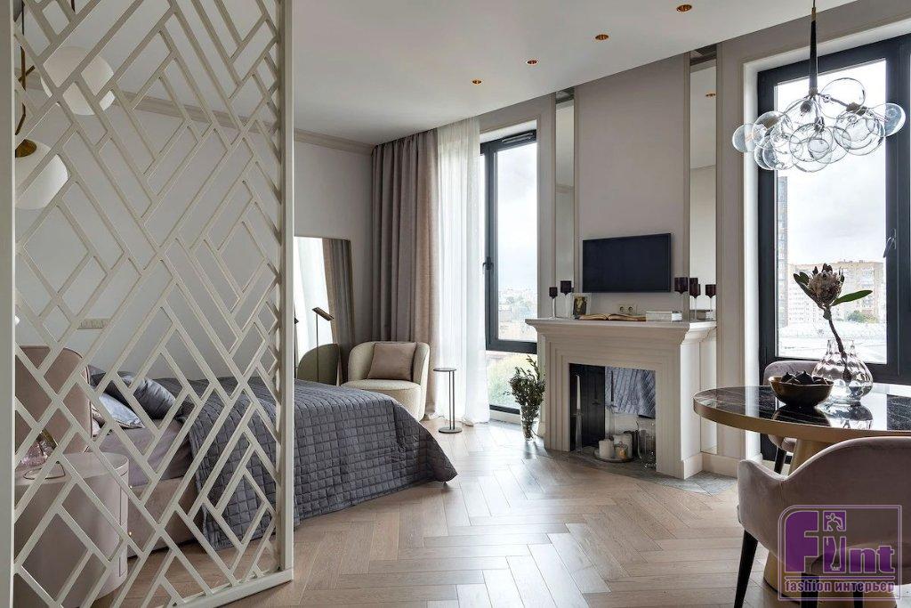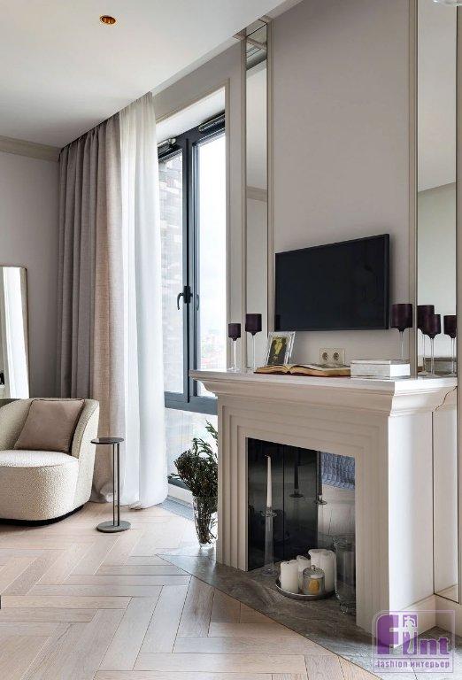 Владелица этой квартиры — молодая девушка, любительница путешествий, для которой эта сфера является ещё и профессией. Среди пожеланий к дизайнеру по интерьерам, архитектору, основателю собственной студии дизайна Наталье Чапило было оформление светлого уютного пространства, где можно было бы расслабиться; большое количество зеркал, декоративный камин и ажурная перегородка между общей зоной и спальней.