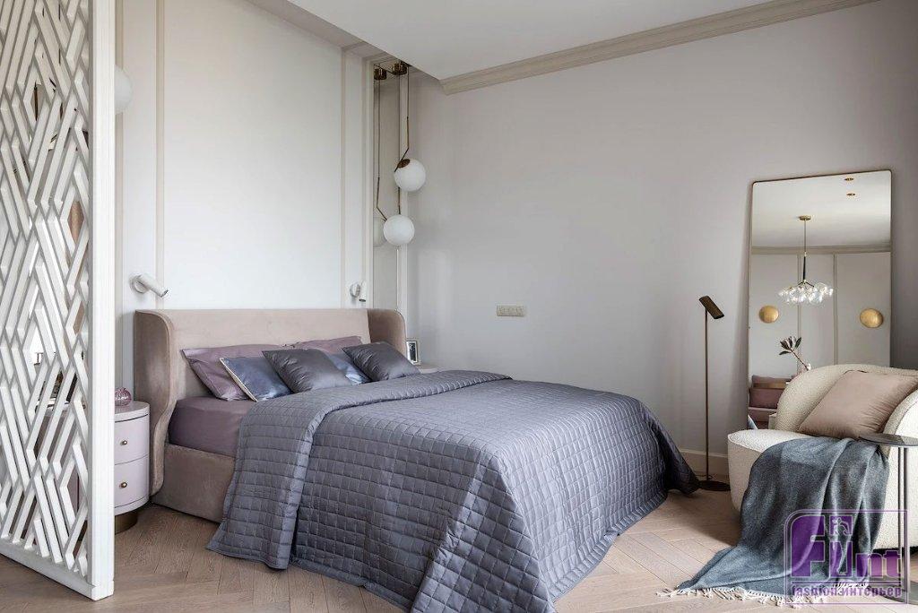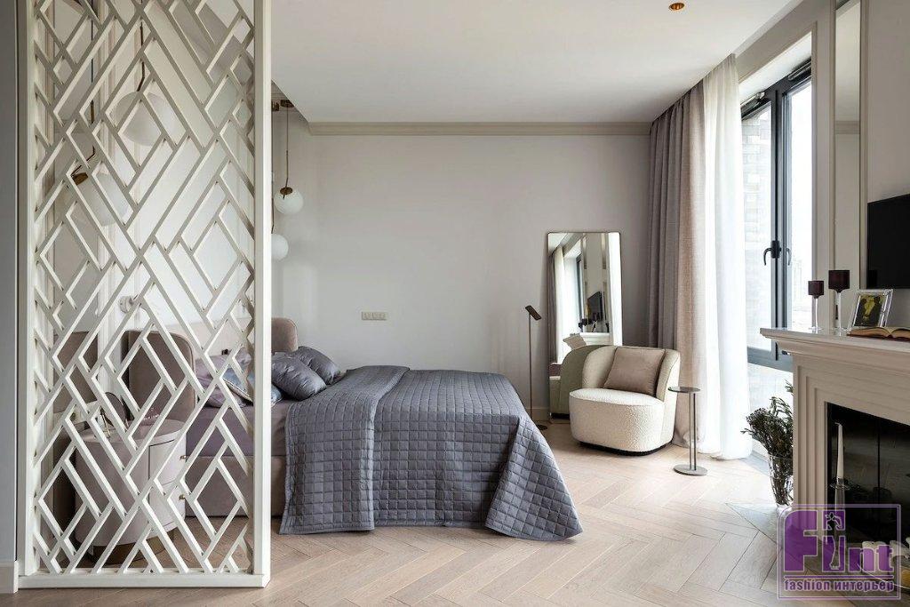 Застройщик сдавал квартиру без перегородок. Планировочное решение разрабатывалось так, чтобы жилое пространство было максимально свободным и просторным. Поэтому было решено не отделять спальню глухой стеной, а сделать общую студийную зону — спальня частично зонирована декоративной ажурной перегородкой. Полностью отделены от общего пространства только ванная комната и гардеробная.