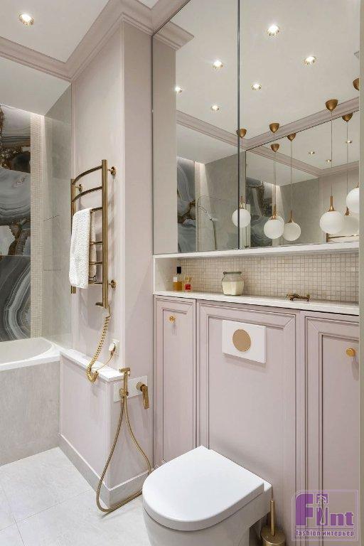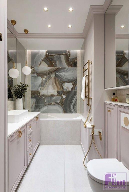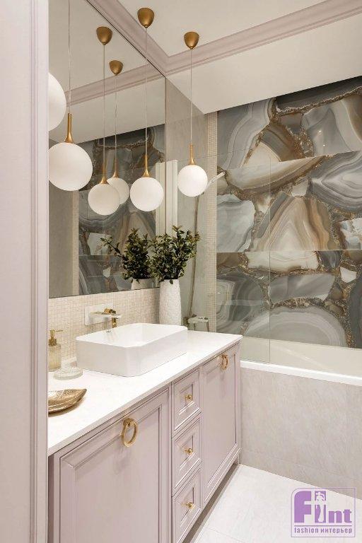 В ванной комнате использовали несколько отделок: крупноформатный керамогранит светлого оттенка на полу, керамогранит под оникс на стене над ванной в качестве акцента, мозаику (в зоне раковины, внутри открытой каменной полки над унитазом, в обрамлении керамогранита в зоне ванны) и краску — там, где нет прямого попадания воды — напротив раковины и унитаза.