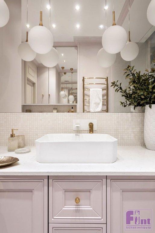 В качестве основного освещения предусмотрели точечные светильники с латунной отделкой — в тон другим деталям интерьера. Декоративный свет — подвесы по бокам от кровати, в прихожей, люстра над обеденным столом, у зеркала в ванной — также подбирали с латунными деталями, чтобы добиться гармонии.