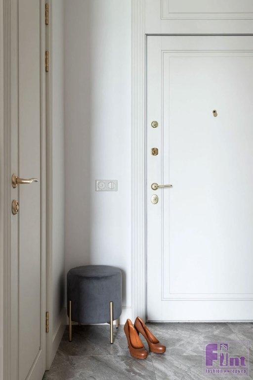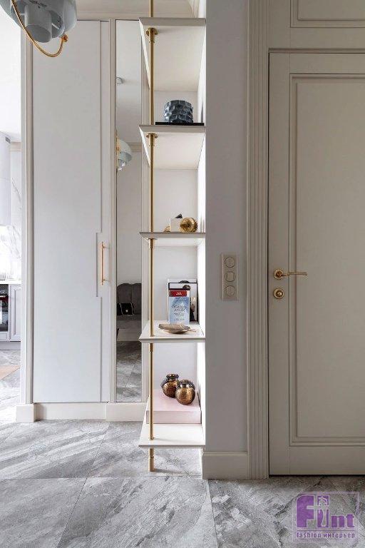 За счет того, что предусмотрели отдельную гардеробную, получилось избавиться от шкафов в жилой зоне. Маленький шкаф для верхней одежды предусмотрели в прихожей — он вписан в нишу между перегородкой кухни и ванной комнатой. Этот шкаф сделали максимально незаметным, в этом помогли фасады в цвет стен и молдинги, которые скрыли стык со стеной. В той же зоне есть стеллаж для книг и декора.