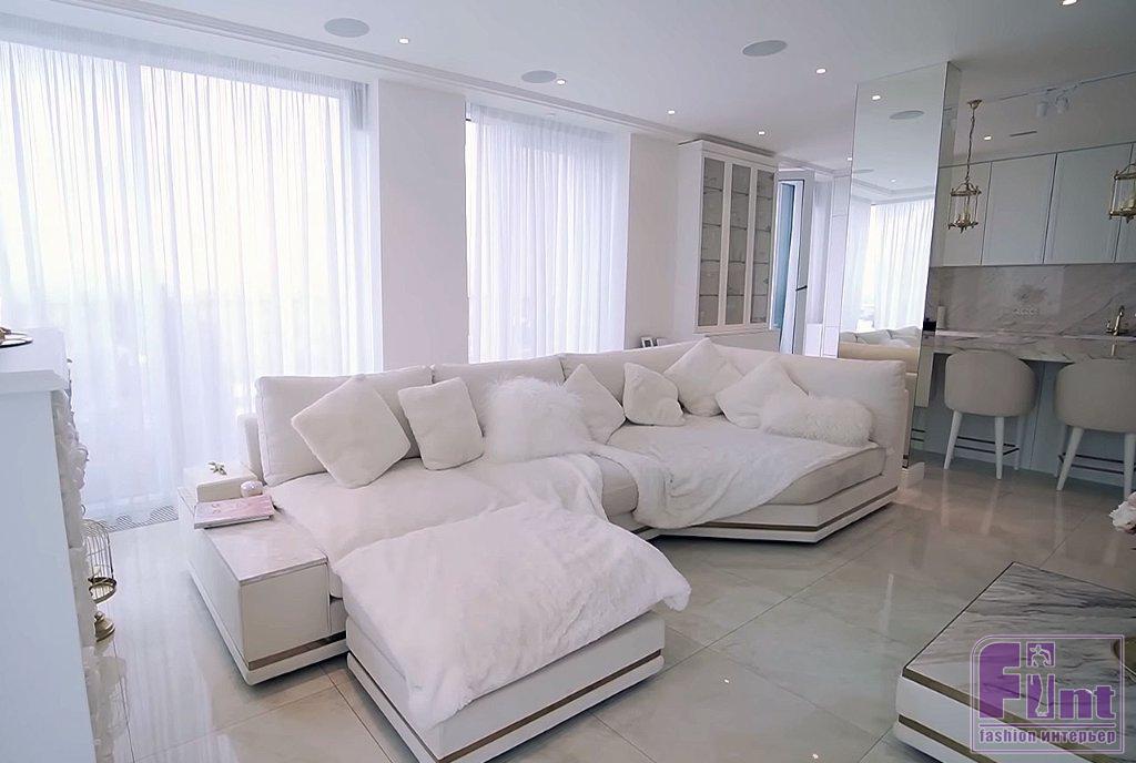 В гостиной Котовой поставили уютный диван, о чем она и просила. «Очень важно, чтобы был большой диван, на который можно лечь, заснуть и не просыпаться все выходные. И мы его нашли. Он воздушный, классный, не хочется вставать с него», — радуется звезда.