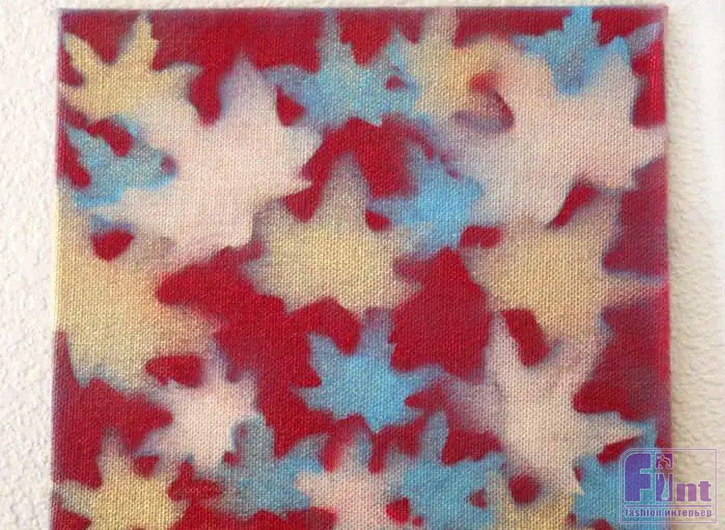 Осталось подождать, пока краска немного подсохнет и наступает момент волшебства! Аккуратно снимите шаблоны листьев и посмотрите, какая красота у вас получилась! На панно удивительно красиво смотрятся маленькие участки разных цветов по краям трафаретов листьев.