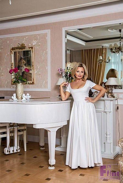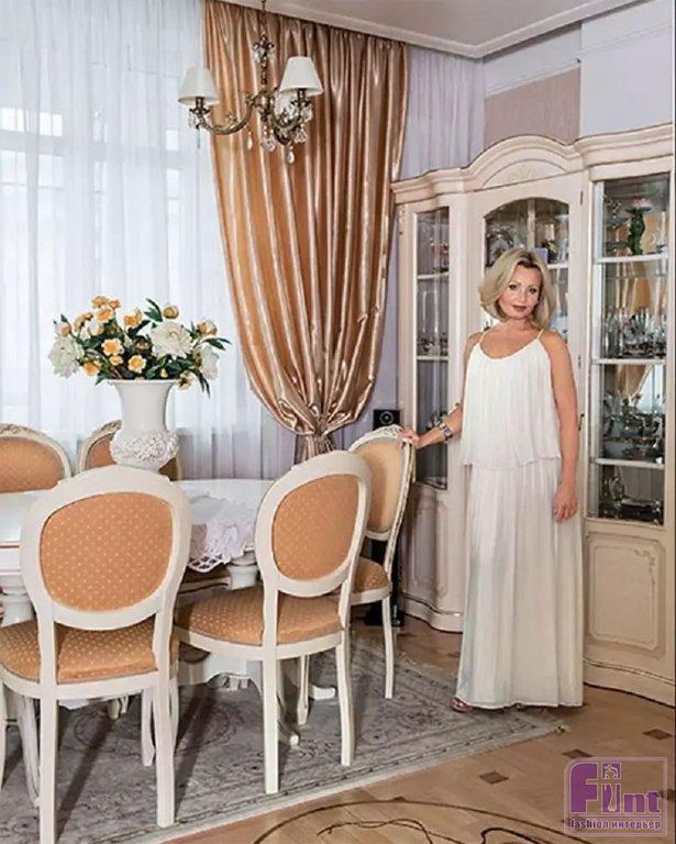 В холле много глянцевых и зеркальных поверхностей, что помогает зрительно увеличить и без того немалое пространство. Актриса не любит громоздкие шкафы, расставленные по квартире, поэтому сделала на заказ огромную гардеробную с большим количеством полок, где умещается вся одежда, обувь, платья, чемоданы и другие аксессуары. В просторной гостиной удалось разместить не только такие привычные предметы, как шкафы, плазменный телевизор и диван, но также камин и роскошный белоснежный рояль. Рядом с широким окном обустроили обеденную зону, а за матовыми распашными дверями скрывается кухня. Кухонный гарнитур выполнен в светлых тонах с золотой каёмкой. Здесь же стоит маленький столик и стулья в том же стиле, что и в гостиной. Весь интерьер выглядит цельным и законченным.
