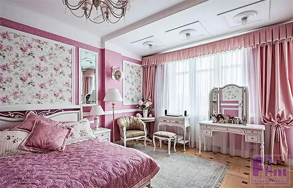 Белоснежная мебель с золотой окантовкой, так же как и для детской, заказывалась в специальной мастерской. Заказная мебель выполнена в классическом итальянском стиле. Люстры, торшеры и светильники Ирина подбирала самостоятельно в обычных магазинах. Из спальни есть выход на лоджию, откуда открывается завораживающий вид на город. Актриса в тёплое время часто выходит и любуется этим видом.