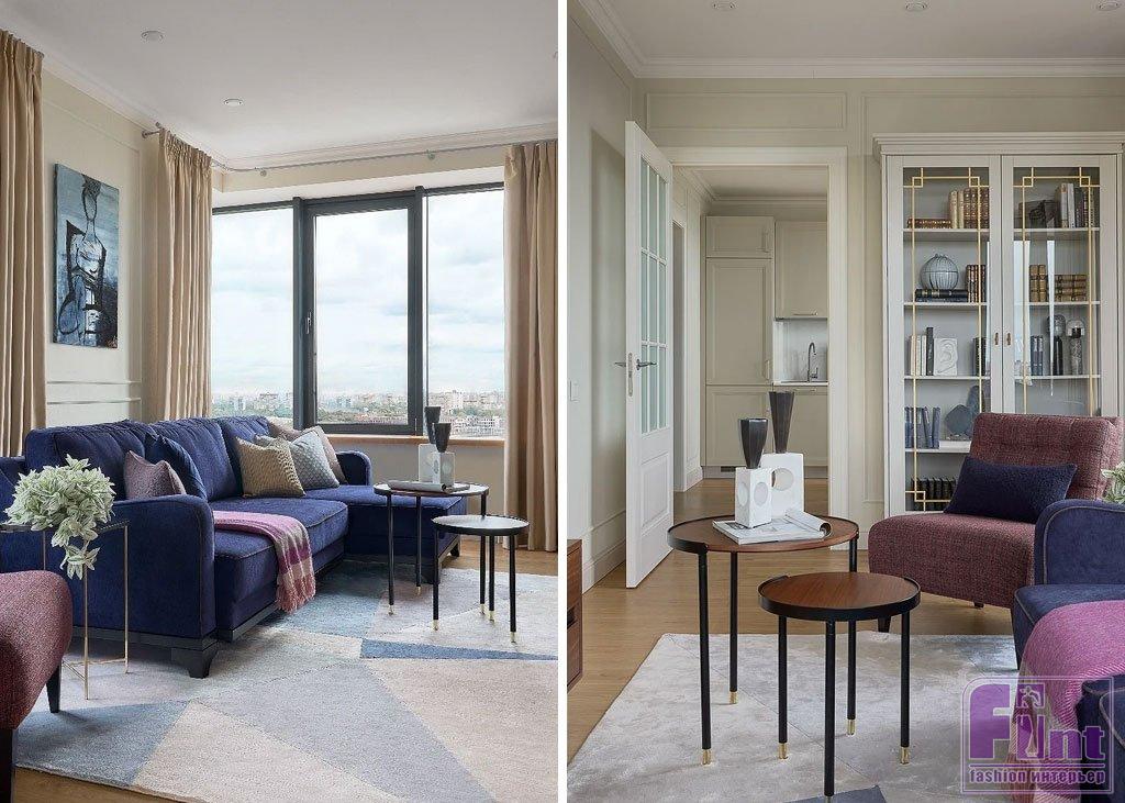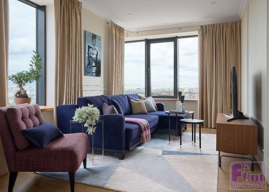 Если в интерьере использована сложная цветовая палитра, можно подобрать ковер, в котором объединятся все оттенки. Это всегда выглядит эффектно. Например, в отделке, мебели и декоре этой гостиной можно найти бежевый, глубокий синий, фиолетовый, слоновую кость — все эти цвета в той или иной интерпретации собраны на ковре. Он становится объединяющим звеном, связывающим разные элементы интерьера, и делает его сбалансированным.