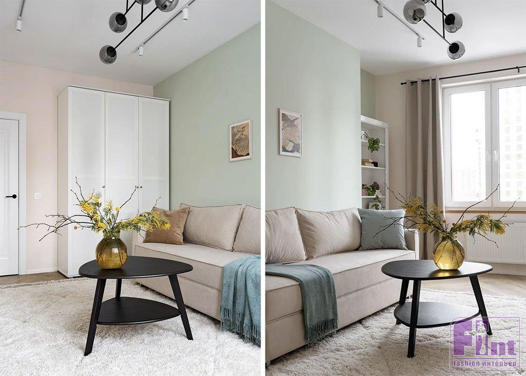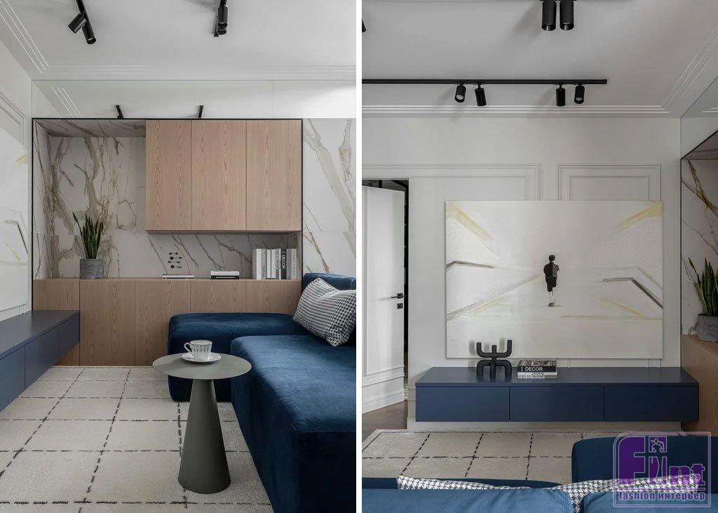 Важно не путать этот приём с ковролином, который давно вышел из моды и только усложняет уборку. Крупным по размеру ковром достаточно перекрыть одну из зон в комнате. В этом проекте ковёр занимает всё пространство от дивана до противоположной стены в гостиной. Такой способ позволяет визуально отделить зону отдыха, сделать её более мягкой и уютной.