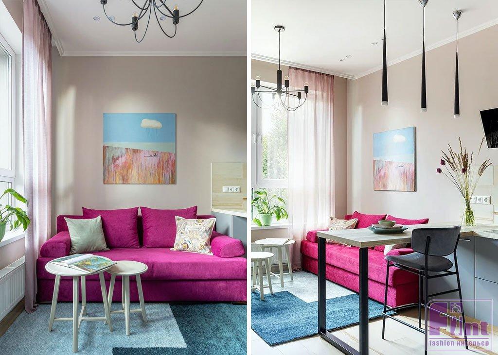 Дизайнеры часто используют цветовой круг, чтобы подобрать два идеально дополняющих друг друга оттенка и собрать на их основе палитру. В этом проекте диван яркого пурпурного оттенка красиво оттеняется сине-зелёным ковром. Похожая контрастная пара (голубой и оранжевый) повторяется в картине на стене. Если у вас дома тоже стоит яркий диван, подберите под его обивку цвет-компаньон и ищите ковёр в этом оттенке.