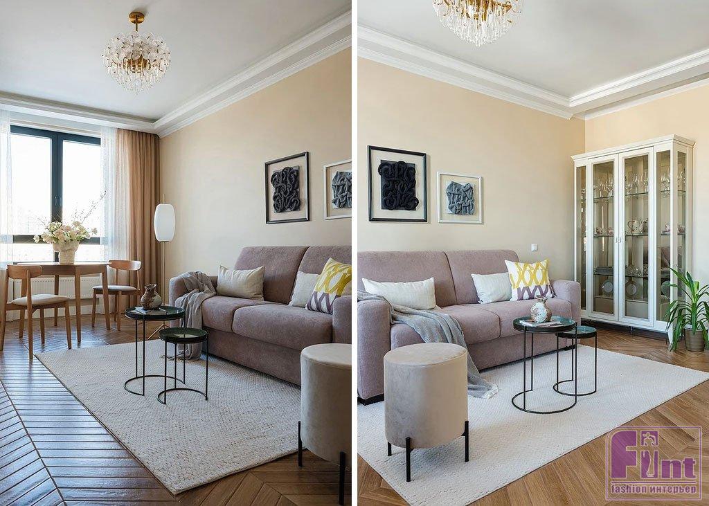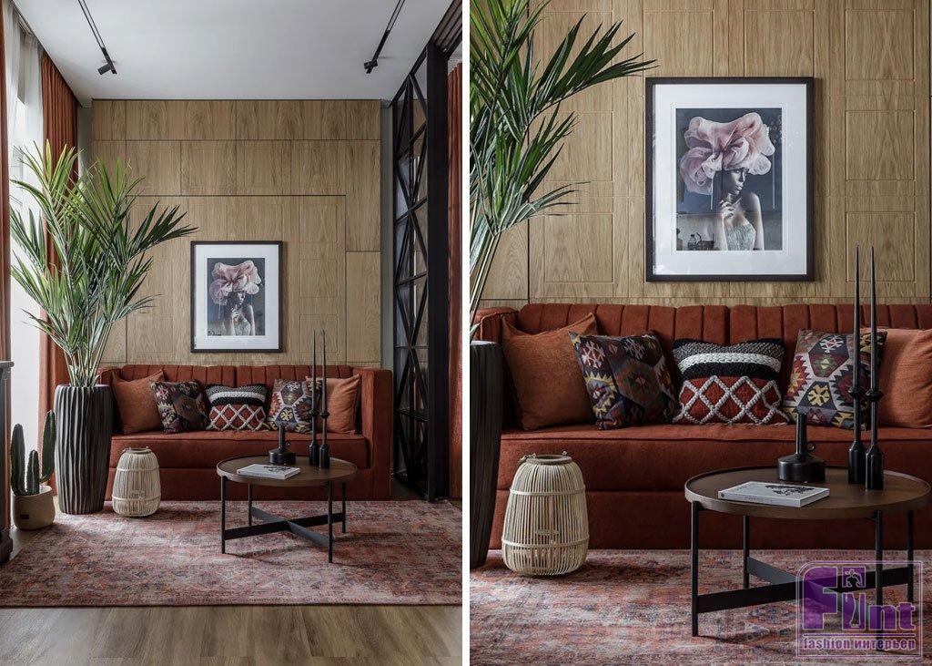 Ещё один интересный приём, который поможет эффектно вписать в пространство ковер: он должен контрастно выделяться на фоне пола. Например, в этой квартире на пол уложена плитка под дерево, и на достаточно тёмном фоне ярко выделяется простой ковёр молочного оттенка. На светлых же полах интересно заиграют тёмные или цветные модели ковров.