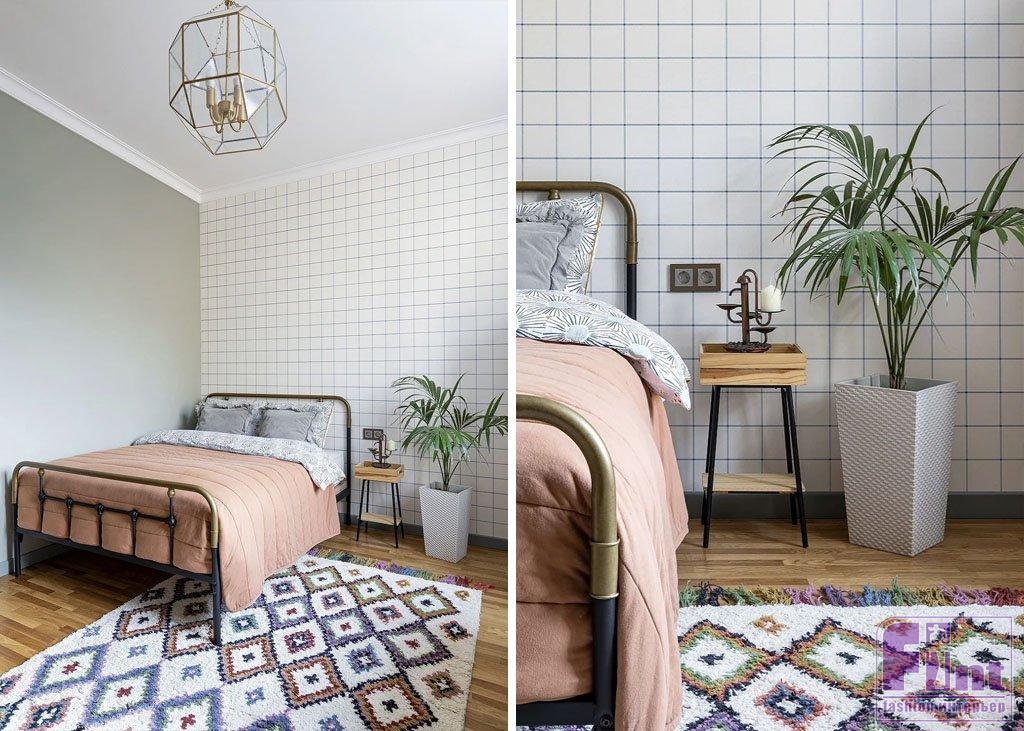 В восприятии интерьера большую роль играют не только текстуры и цвета, но и орнаменты. Так, в этой комнате очень спокойная отделка и минималистичное наполнение, поэтому ковёр играет роль акцента, задающего настроение. Светлое полотно с разноцветным геометрическим узором добавляет спальне этнических мотивов и делает её интереснее.