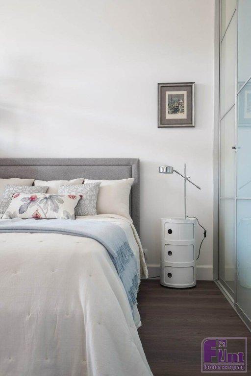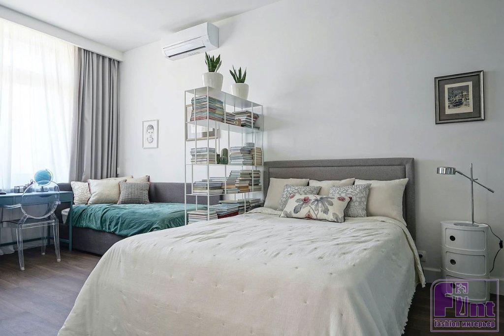 В квартире — объединённая кухня-гостиная, просторная ванная и отдельный санузел, спальня с выделенной гардеробной. Эта планировка была сделана и узаконена прошлым владельцем, и её не стали менять. Для зонирования спальни решили не строить дополнительные перегородки, ограничились стеллажом, который выполнил эту функцию.