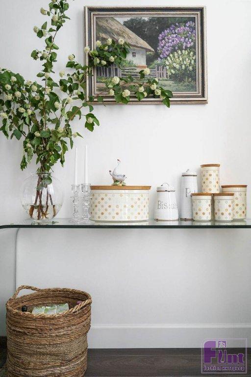 Светлые стены стали отличным фоном для того, чтобы совместить мебель из разных «историй» и для декора заказчицы. Тёмный же пол контрастирует со светлыми стенами, делая интерьер интереснее и глубже. В поддержку цвета пола — тёмные оконные рамы.