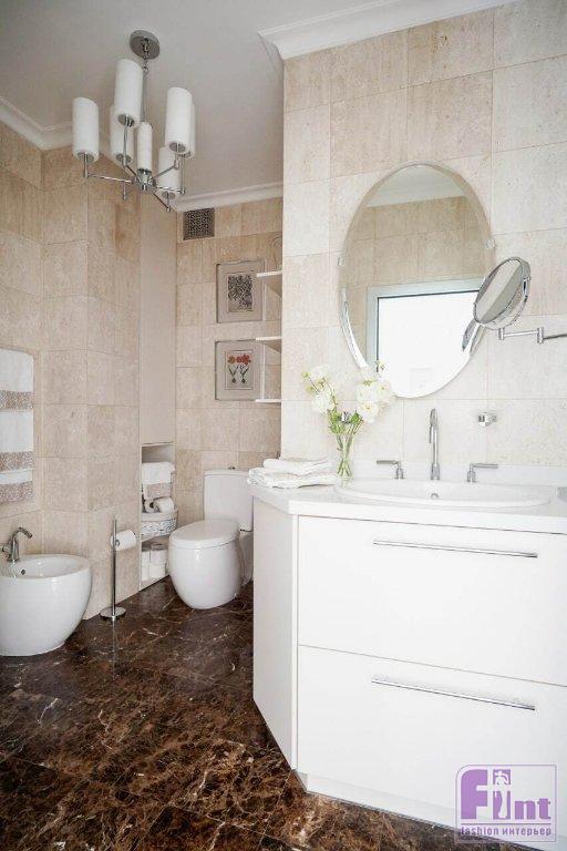 Освещение, которое было в квартире, заменили. На потолке предусмотрели точечные светильники. «Мы воспользовались идеей из художественных галерей и сделали споты с направленным светом, чтобы позже направлять свет на картины», — комментирует автор проекта. Дополнительные сценарии реализовали с помощью настольных ламп. В ванной комнате решили сделать люстру. Нетипично для этой зоны, но выглядит эффектно.