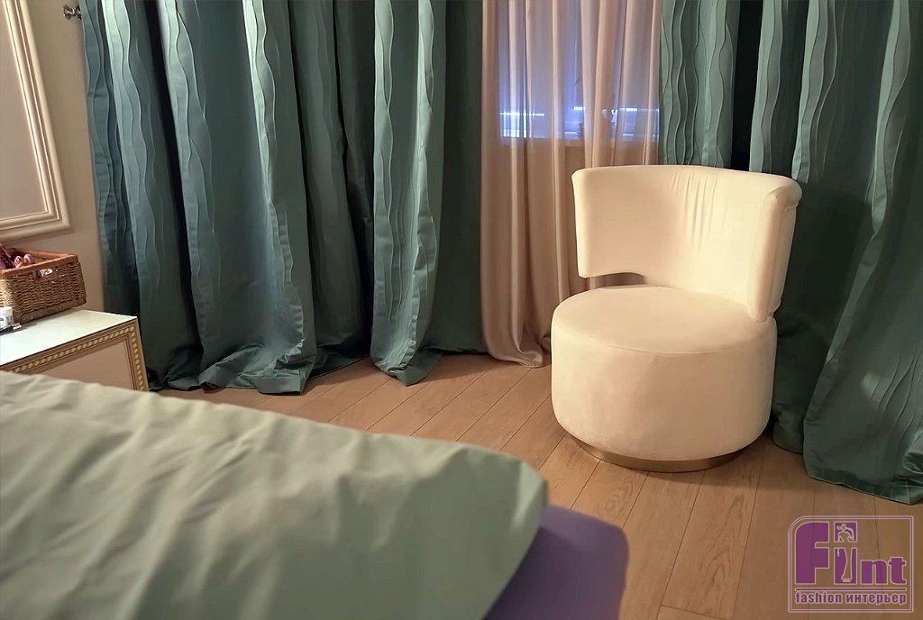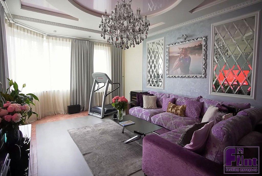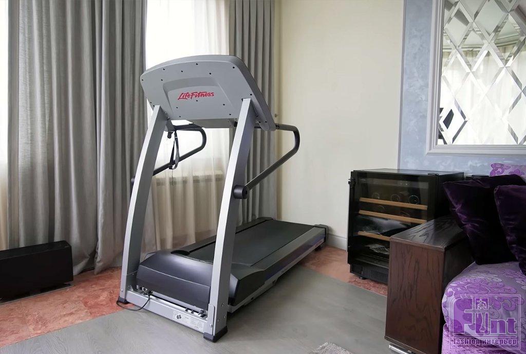 Окна квартиры Анны Семенович задрапированы белоснежным тюлем, портьерами в розовой и коричневой гамме и эффектным ламбрекеном, закреплённым плавной волной на карнизе. Рядом с окном в гостиной поставили беговую дорожку, на которой Анна поддерживает свою физическую форму.