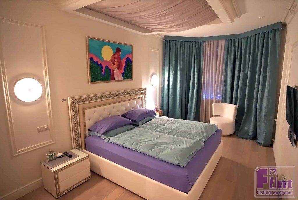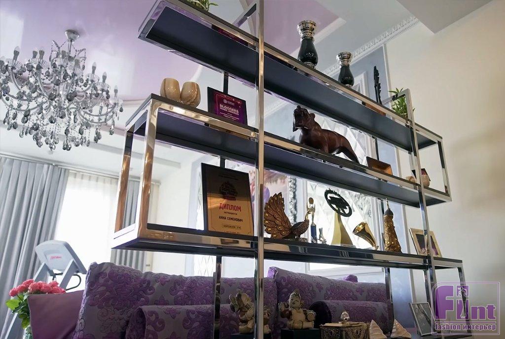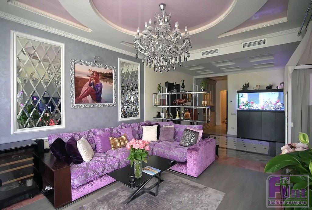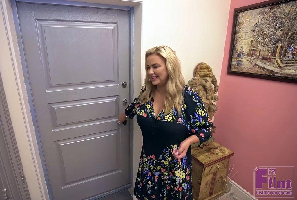 В своей квартире две комнаты Анна отвела под гардеробную, кроме того, она с большим комфортом оформила гостиную, кухню, две спальни, каждая из которых имеет отдельную ванную. Всего за шесть месяцев апартаменты были полностью переоборудованы. Анна решила не устанавливать в гостиной межкомнатные двери, а отделить зону отдыха большим аквариумом, который она заселила яркими китайскими рыбками. Всё пространство выдержано в нежной розовой гамме. На потолке сделали фигурную конструкцию из гипсокартона и установили натяжное глянцевое полотно, которое визуально увеличило высоту комнаты.