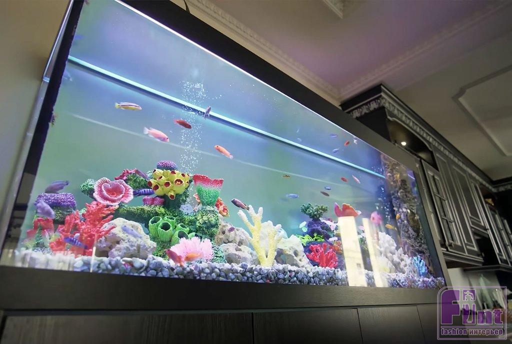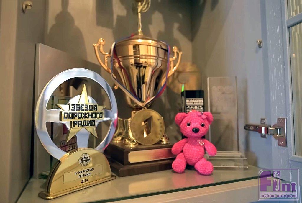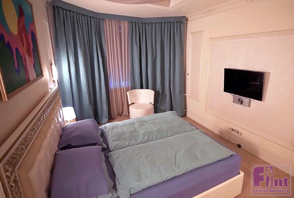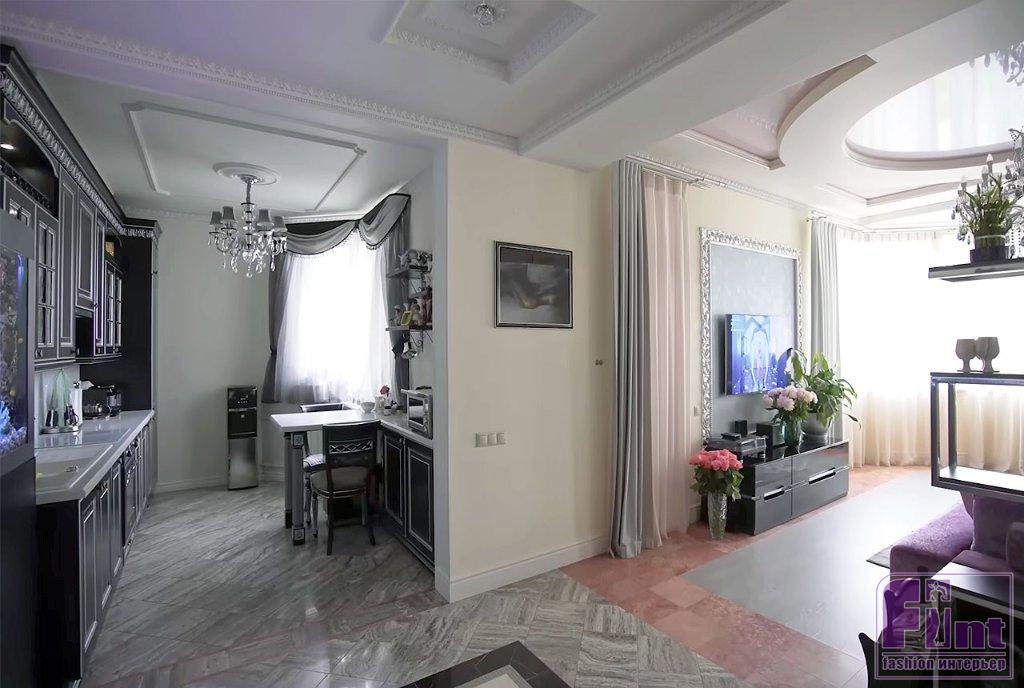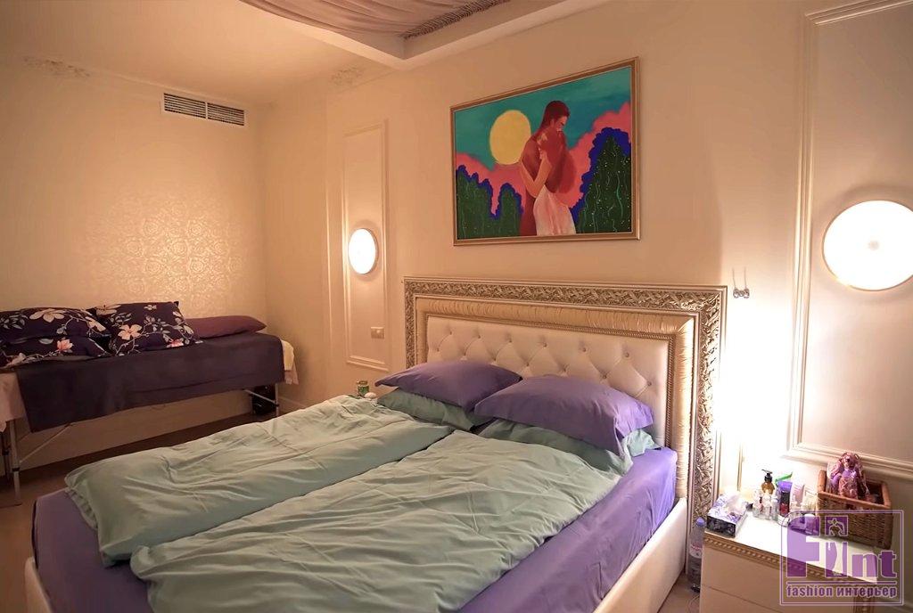 В своей квартире две комнаты Анна отвела под гардеробную, кроме того, она с большим комфортом оформила гостиную, кухню, две спальни, каждая из которых имеет отдельную ванную. Всего за шесть месяцев апартаменты были полностью переоборудованы. Анна решила не устанавливать в гостиной межкомнатные двери, а отделить зону отдыха большим аквариумом, который она заселила яркими китайскими рыбками. Всё пространство выдержано в нежной розовой гамме. На потолке сделали фигурную конструкцию из гипсокартона и установили натяжное глянцевое полотно, которое визуально увеличило высоту комнаты.