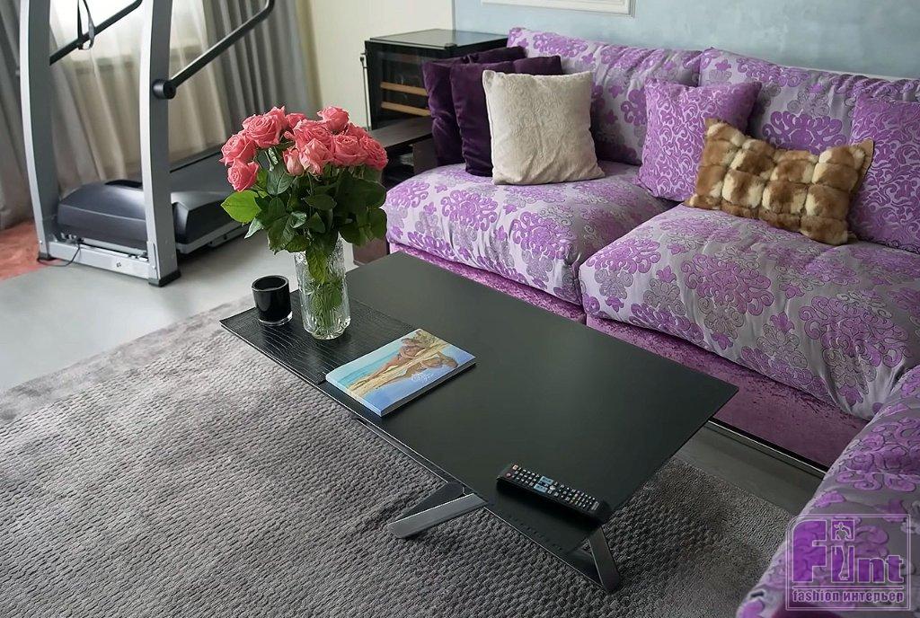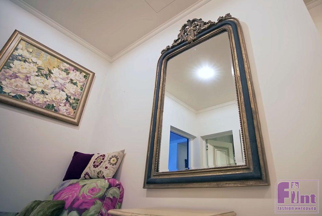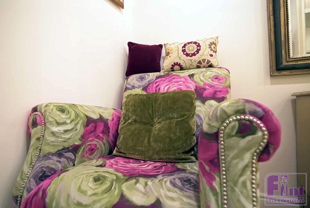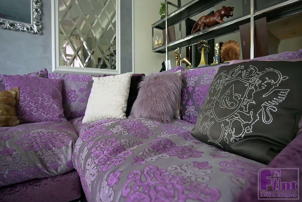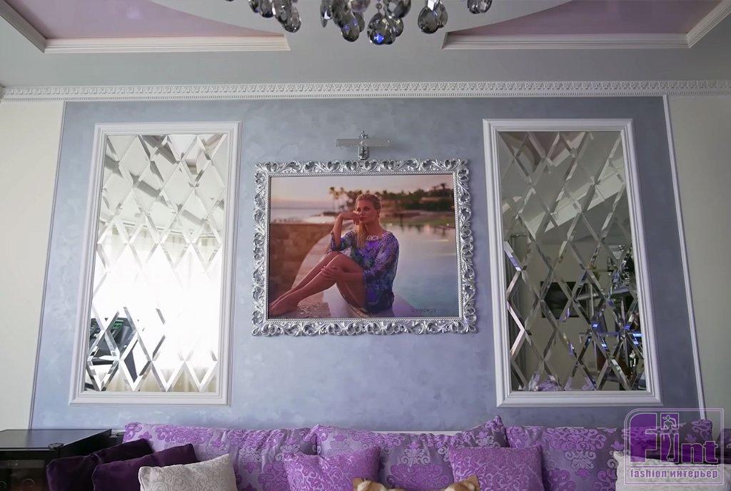 В зоне отдыха поставили угловой диван с велюровой обивкой в розово-лиловой гамме с флористическим орнаментом на обивке. На стене за диваном установили два панно с зеркальными ромбами, пространство между ними заняла картина с изображением хозяйки квартиры.