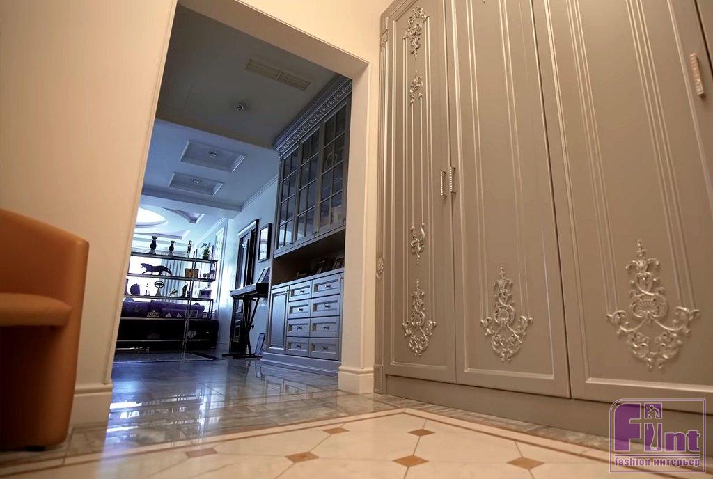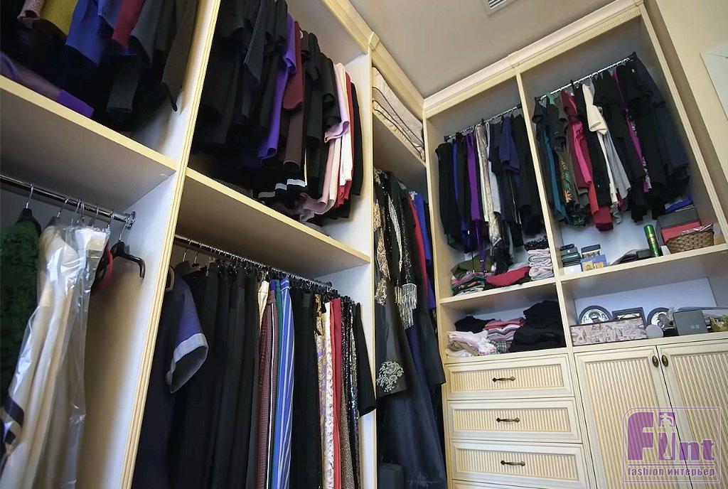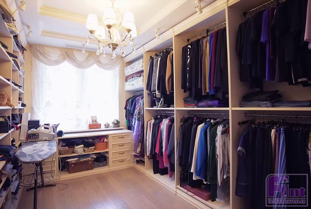 У Анны Семенович много одежды, обуви и аксессуаров, поэтому большую территорию квартиры она отвела под гардеробную, соединив две комнаты. Анне важно, чтобы все аксессуары, одежда, сумки и обувь хранились в идеальном порядке по отдельности на разных стеллажах. Полочки сделали из МДФ, покрашенной в белый цвет. Актриса подобрала стильные коробочки и плетёные корзинки для хранения мелких предметов гардероба. Для постельного белья, подушек и одеял установили высокие шкафы в прихожей.