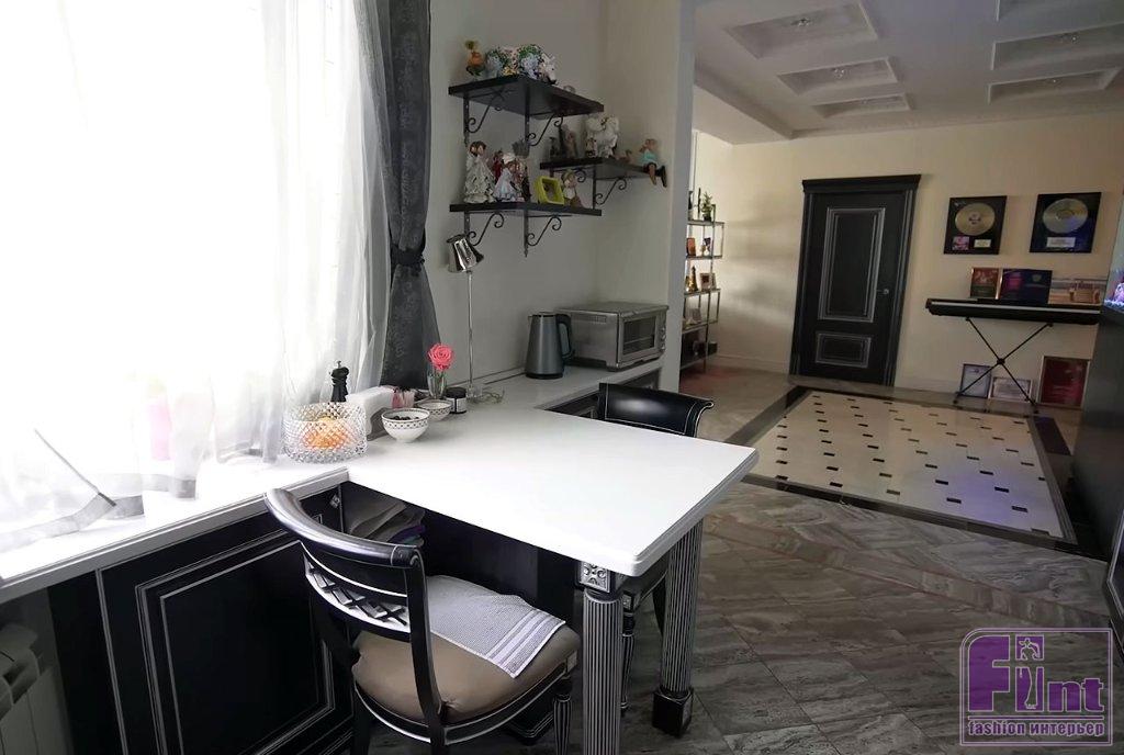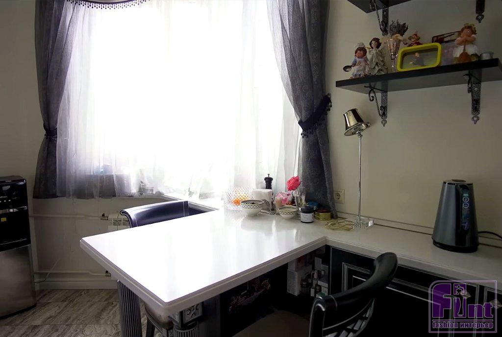 Поскольку основной акцент сделан на мебели, стены просто покрасили в светло-молочный оттенок, а для пола выбрали плитку под мрамор. Напротив рабочей зоны возле окна оборудовали небольшой столик, за которым можно выпить чашечку кофе. Обеденную зону в чёрной гамме устроили у входа на кухню.
