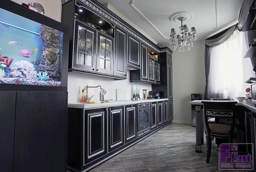 Анна всегда мечтала о чёрной мебели на кухне. Для того чтобы она не выглядела мрачной, шкафчики сделали глянцевыми и декорировали серебряными вставками. К ним идеально подобрали стальные ручки-кнопки. Вся бытовая техника встроенная, это очень удобно.