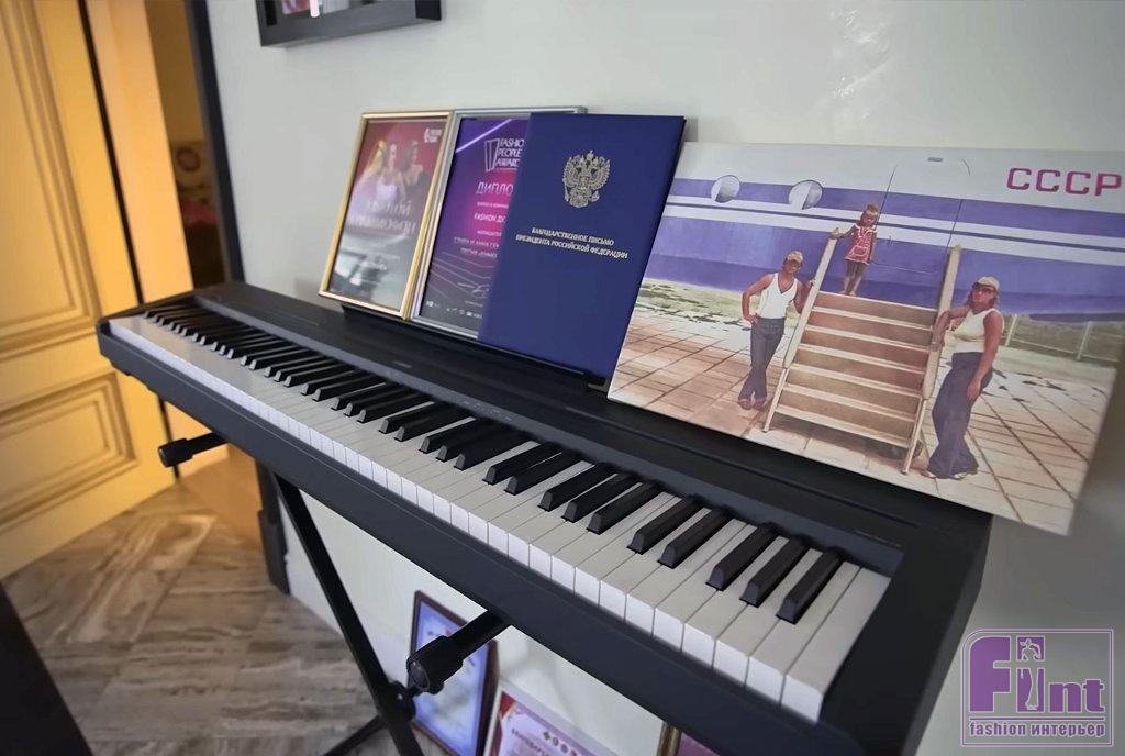 В декоре использовано большое количество ярких элементов, блестящих деталей и глянцевых поверхностей. Даже прихваты для портьер усеяны стразами. Глядя на такое оформление, сразу видно, что здесь живёт женщина. В гостиной стоит легендарный фикус, в который Анна влюбилась с первого взгляда. Это был выставочный экземпляр, он не продавался, но актриса так просила сотрудников, что они сдались. Иногда он цветёт, а под Новый год служит по совместительству ёлкой.