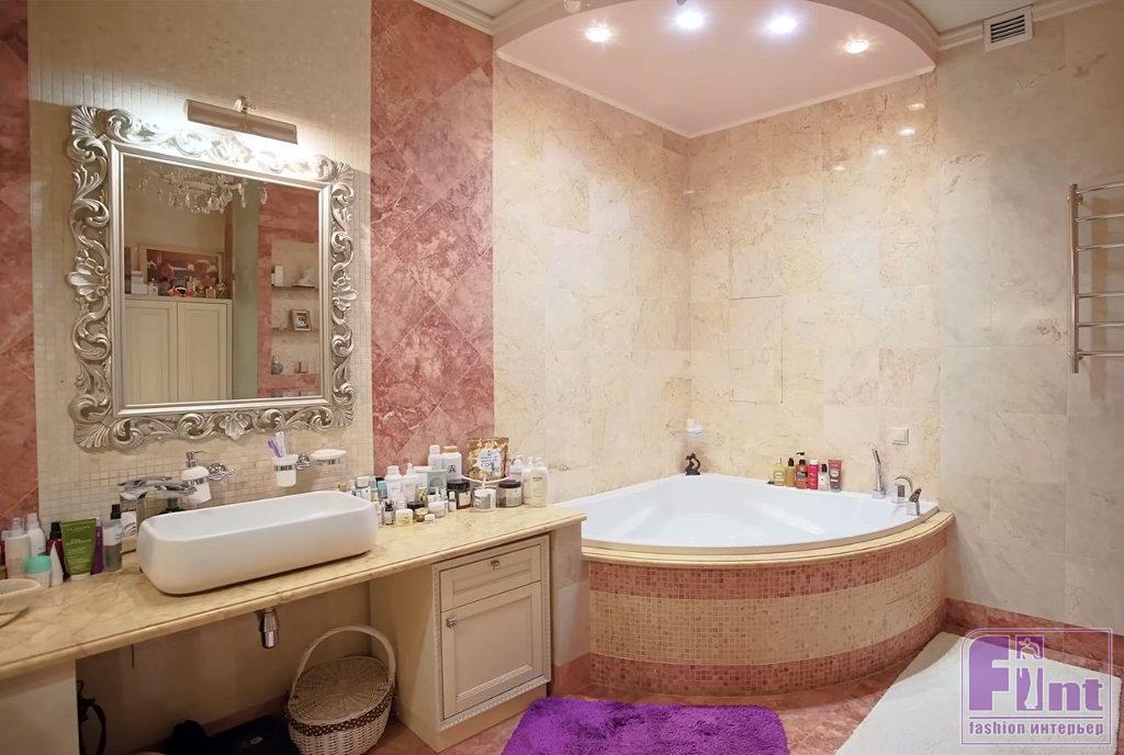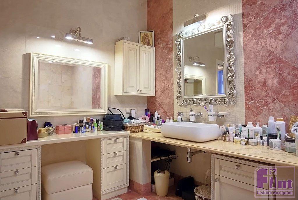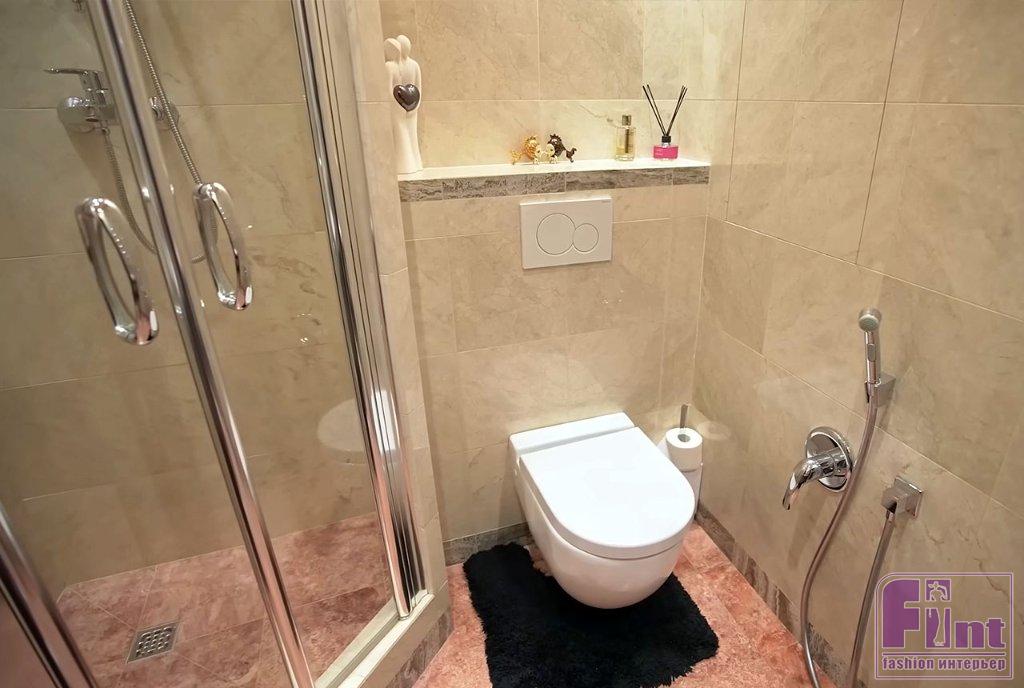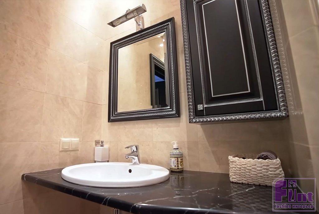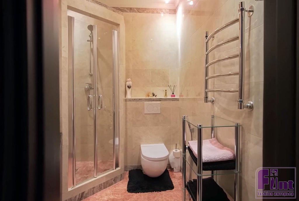 Стены комнаты облицевали итальянским кафелем в жёлтом цвете, на полу выложили ковёр из белой плитки с декором, обрамлённый коричневыми фрагментами. В помещении реализовали два сценария освещения: центральную классическую люстру с хрустальными подвесками и точечную подсветку над полукруглой чашей. Площадь позволила установить душевую кабинку за перегородкой из матового стекла. Умывальник установили на тумбу молочного оттенка со столешницей из натурального камня.