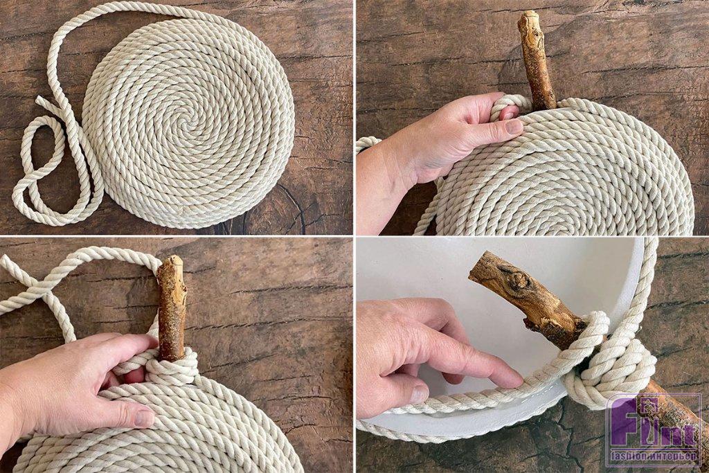 Возьмите моток верёвки, при необходимости отрежьте заклеенный скотчем или оплавленный конец, поскольку при продаже концы верёвок часто обрабатывают подобным образом, чтобы они не распускались. Нанесите немного горячего клея примерно на 2-3 см от конца верёвки, а затем сверните ее в спираль. Немного подержите свёрнутый конец верёвки, чтобы клей остыл, а затем нанесите немного клея на обратную сторону спирали и положите её по центру тарелки.