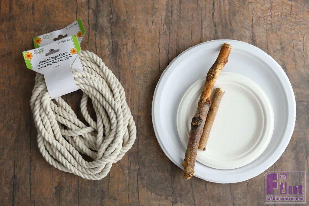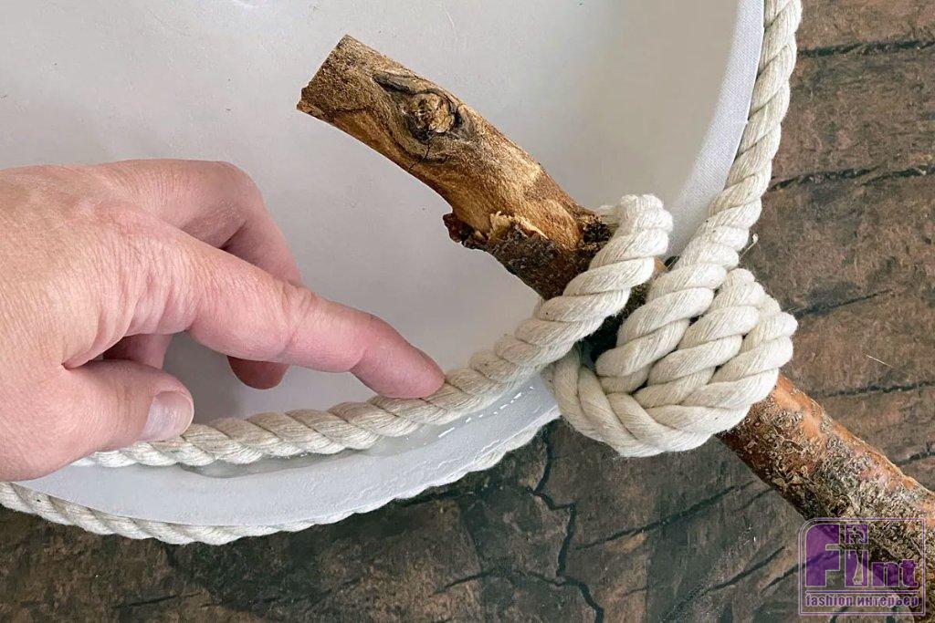 Переверните тарелку и оберните верёвку вокруг палочки ещё раз, на этот раз ниже того места, где она крепится к тарелке. Затем надежно приклейте конец веревки к обратной стороне тарелки. Нанесите достаточное количество клея и подождите несколько минут, чтобы он полностью застыл.