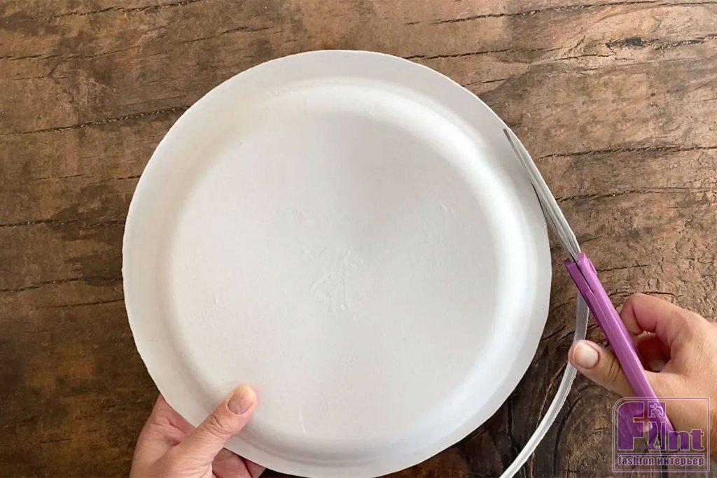 Если ваша спираль получилась немного не по центру и основная часть тарелки полностью закрыта витками спирали, но край тарелки с какого-то края остаётся незакрытым, просто обрежьте этот лишний фрагмент тарелки ножницами.