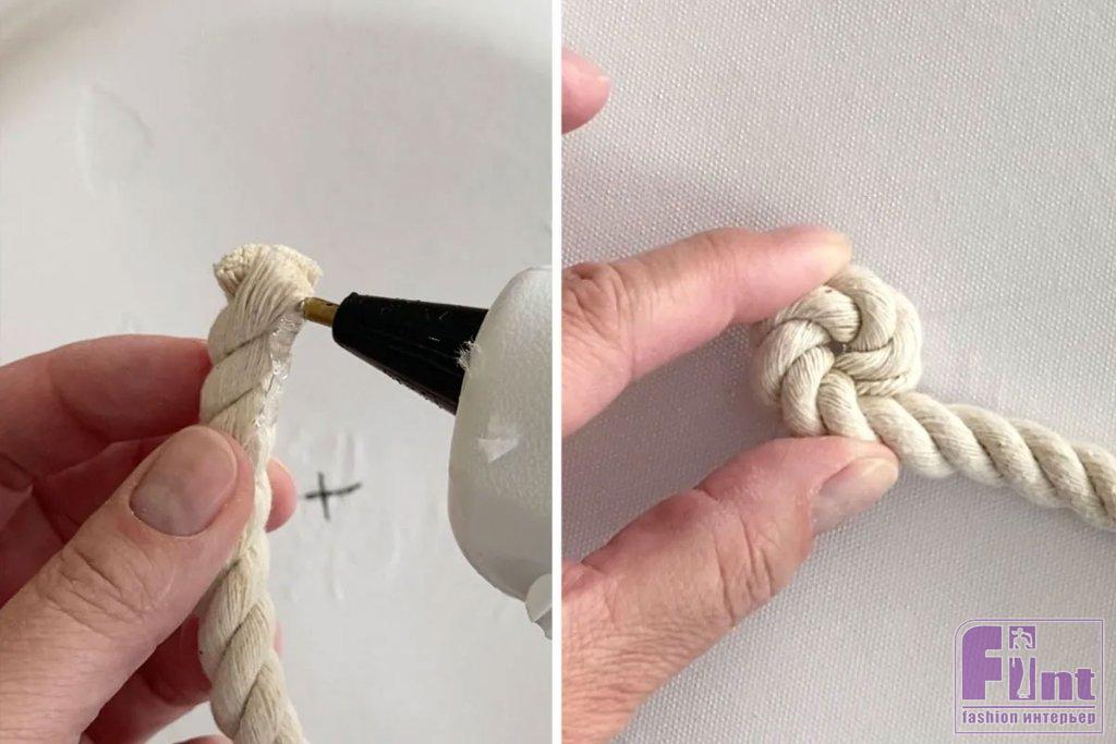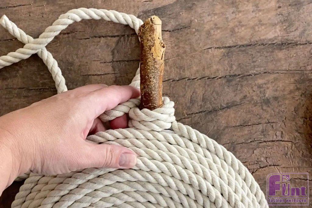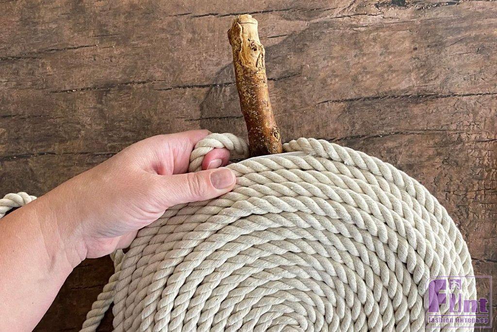 Дважды оберните верёвку вокруг палочки, приклеивая горячим клеем по мере обёртывания. Подождите немного, чтобы клей застыл. Такой способ поможет прочнее закрепить палочку на изделии, чтобы она не отвалилась от случайного прикосновения.