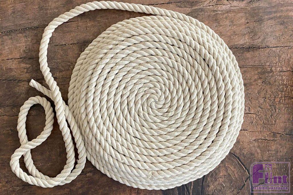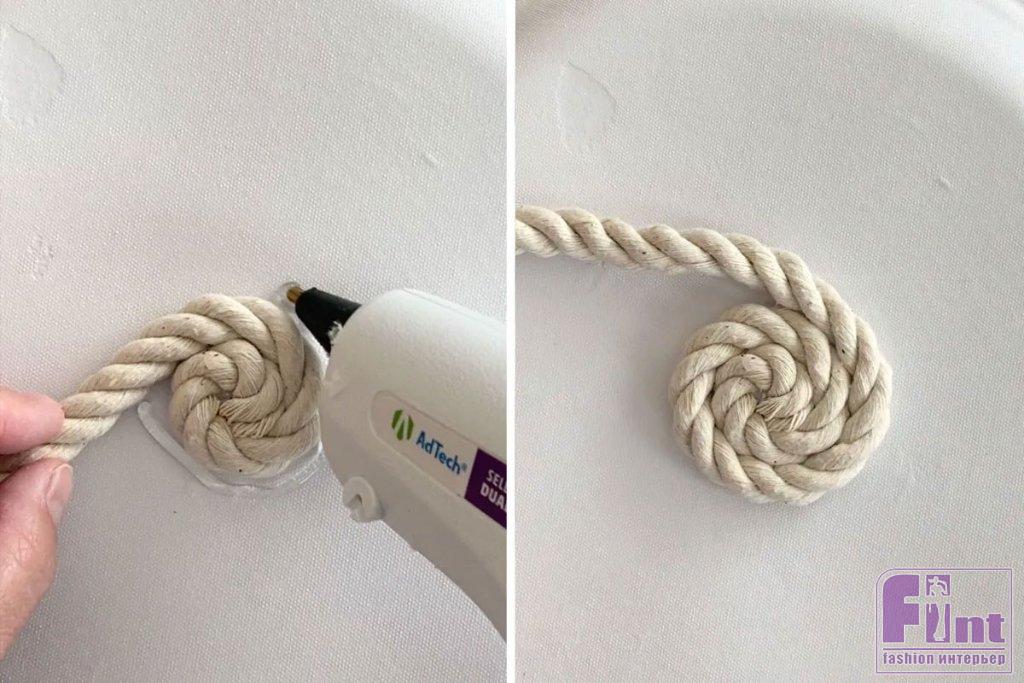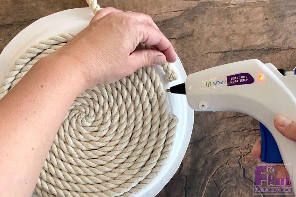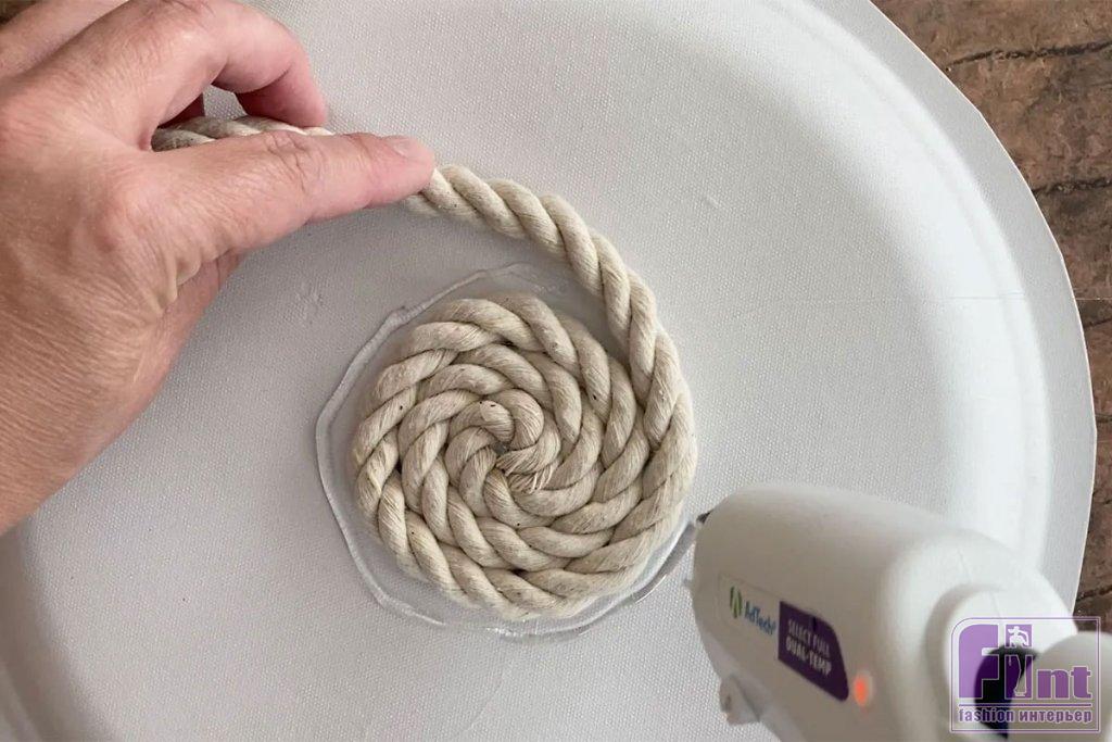 Возьмите моток верёвки, при необходимости отрежьте заклеенный скотчем или оплавленный конец, поскольку при продаже концы верёвок часто обрабатывают подобным образом, чтобы они не распускались. Нанесите немного горячего клея примерно на 2-3 см от конца верёвки, а затем сверните ее в спираль. Немного подержите свёрнутый конец верёвки, чтобы клей остыл, а затем нанесите немного клея на обратную сторону спирали и положите её по центру тарелки.