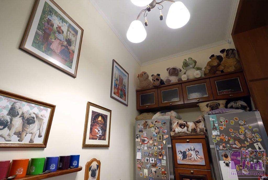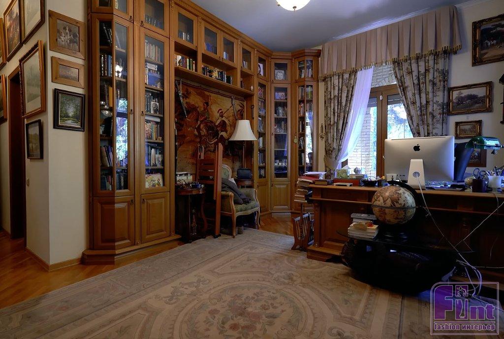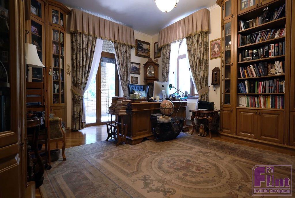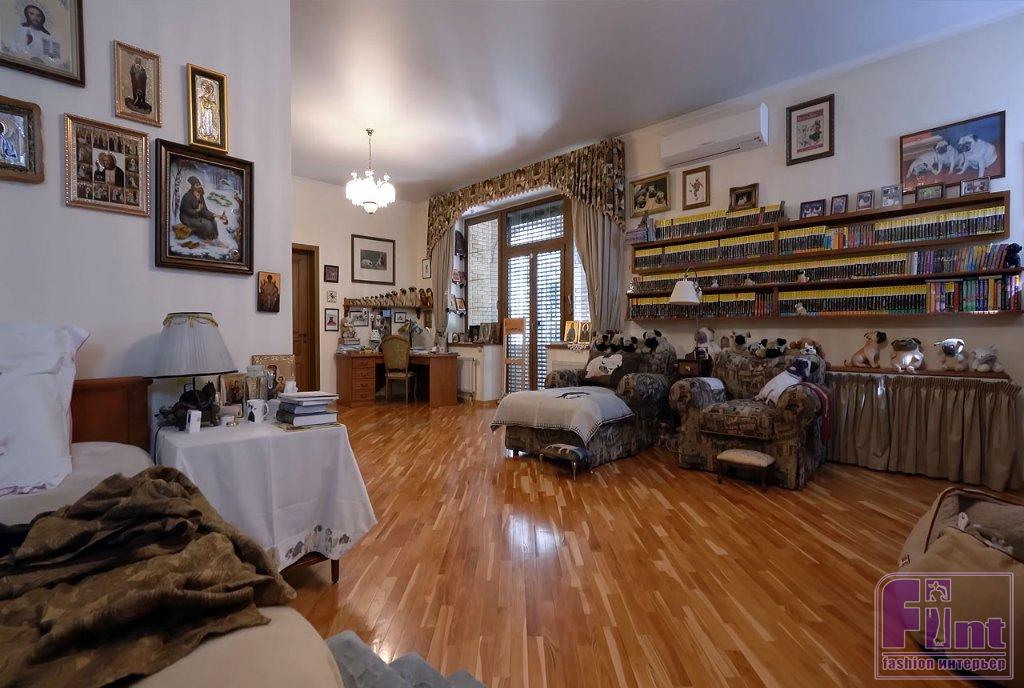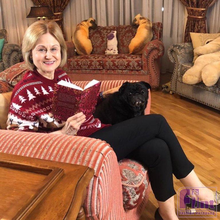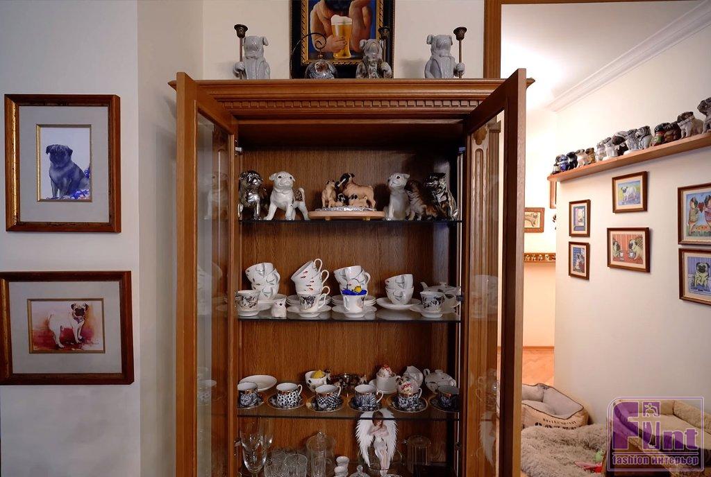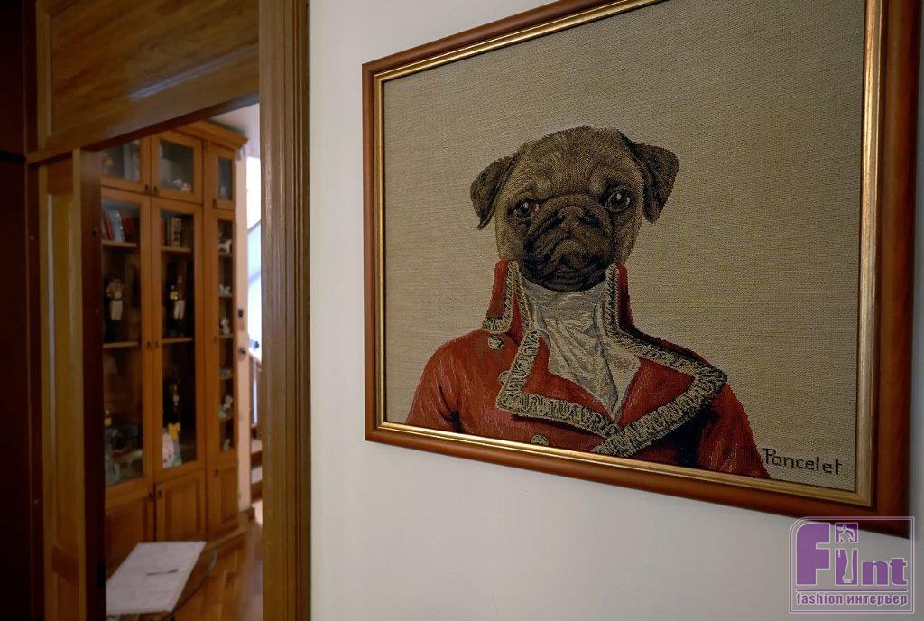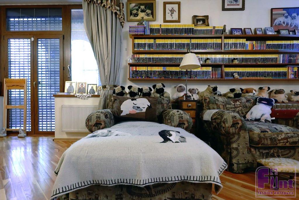 Библиотека тоже оформлена в классическом стилевом направлении. Тут есть ореховые стеллажи и шкафы, пышные кресла с нежным цветочным принтом, подушки с изображениями мопсов. Целой россыпью картин с собаками оформлена и входная дверь в библиотеку, и некоторые стены.