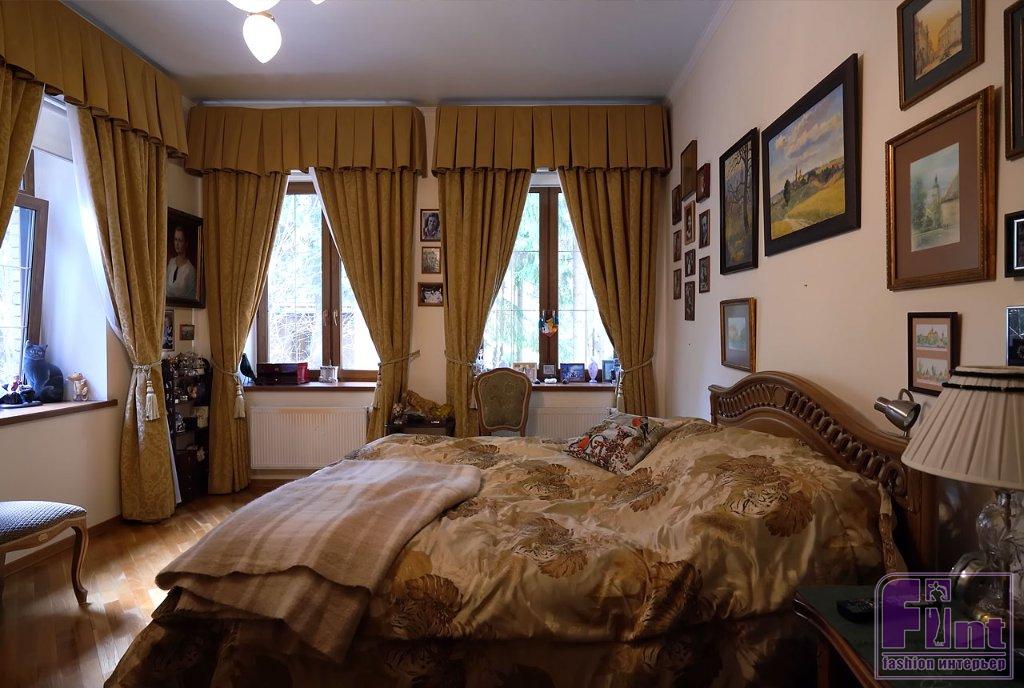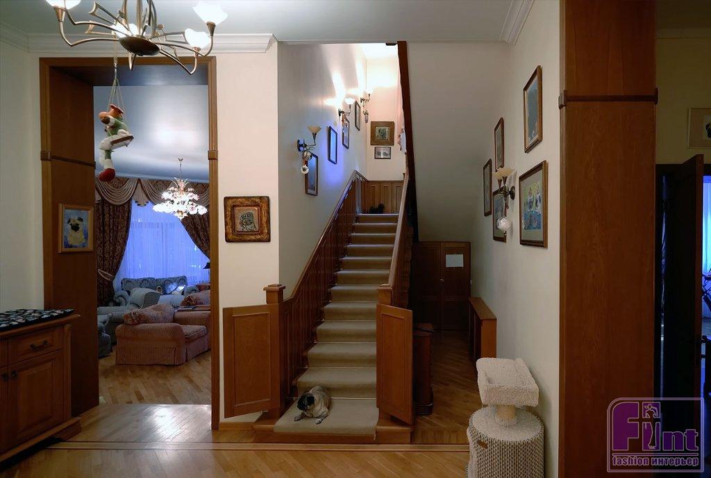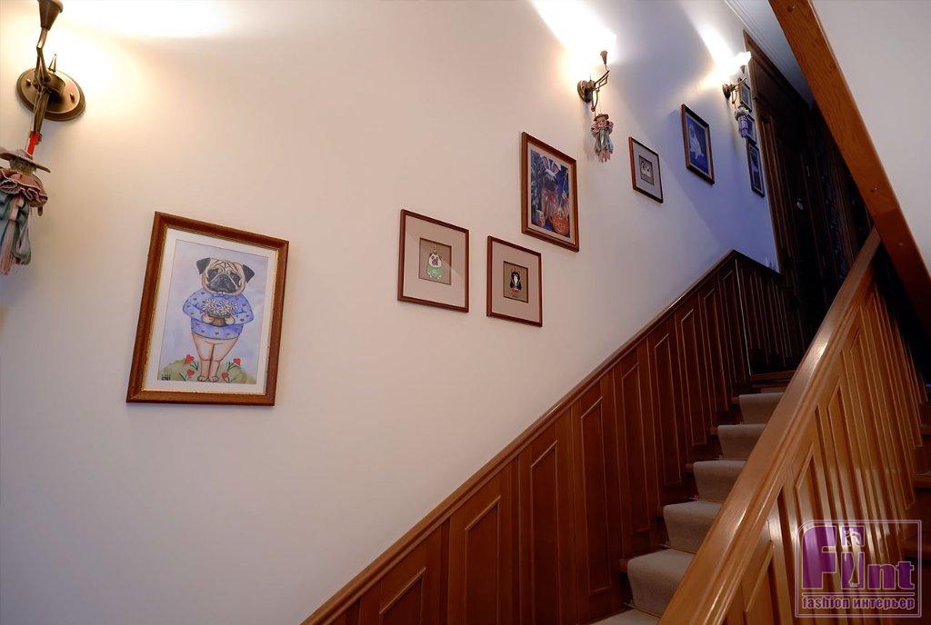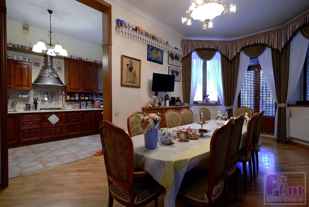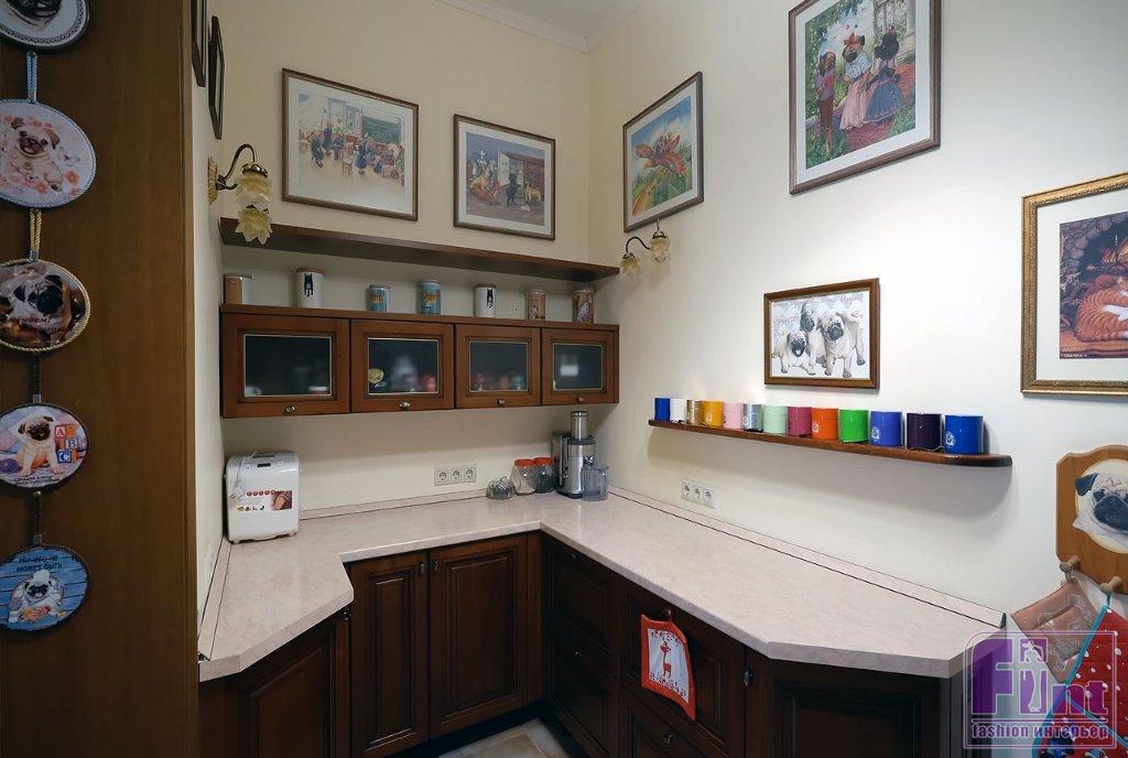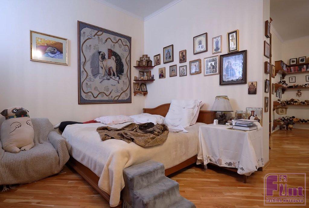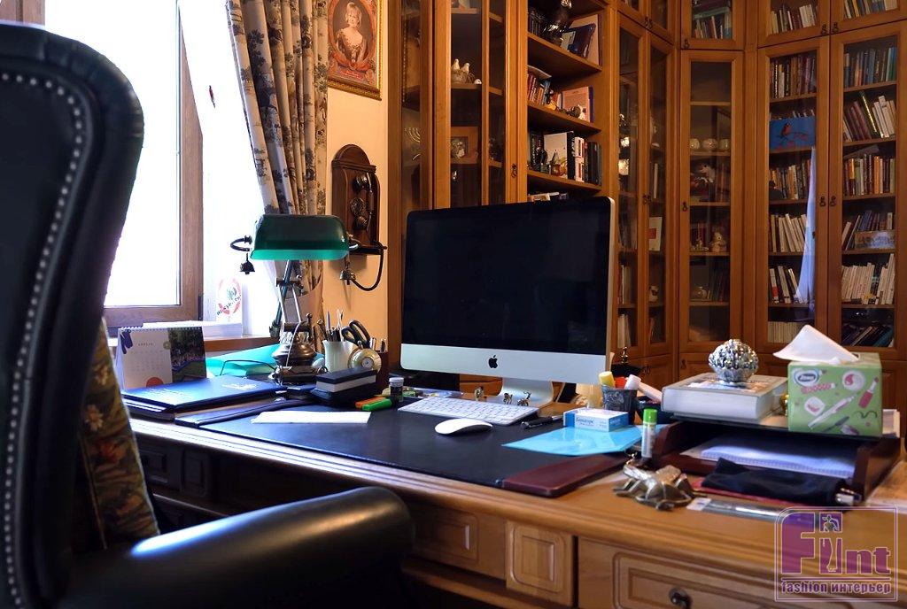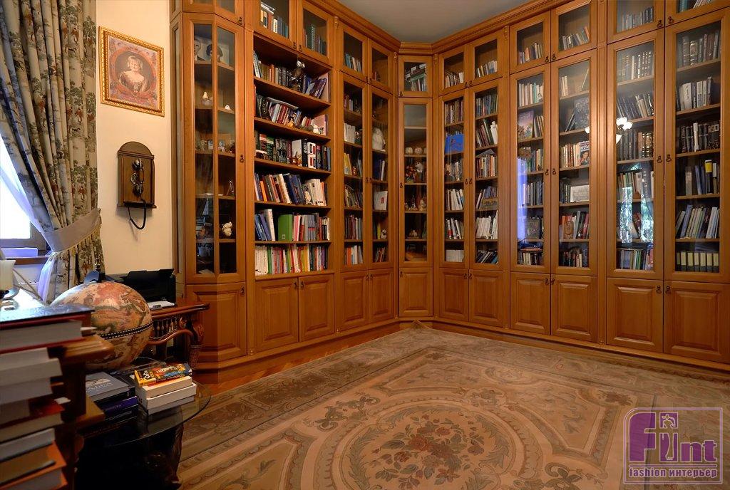 Библиотека тоже оформлена в классическом стилевом направлении. Тут есть ореховые стеллажи и шкафы, пышные кресла с нежным цветочным принтом, подушки с изображениями мопсов. Целой россыпью картин с собаками оформлена и входная дверь в библиотеку, и некоторые стены.