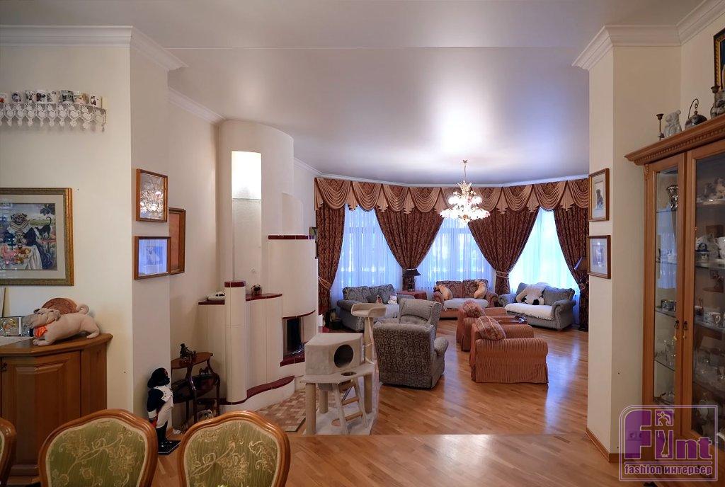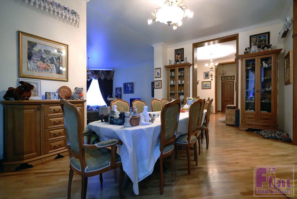 Гостиная и столовая в доме Донцовой объединены, в результате чего получилось довольно просторное помещение для приёма гостей и семейного отдыха. В центре комнаты — большой стол с красивой клетчатой скатертью и стульями в дворцовом стиле с мягкой тканевой обивкой. Белые крашеные стены являются отличным фоном для картин и фото мопсов в золотистых рамках, хорошо гармонируют с резными дверями и мебелью.