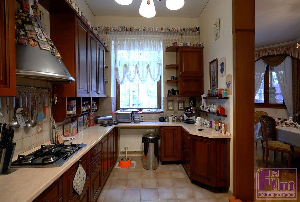 Особняк звезды отечественного детектива оформлен в классических тонах: спокойных и неярких. В общем убранстве превалируют коричневые, сероватые, бежевые и молочные оттенки. Кухня обставлена красивой мебелью из деревянного массива, дополненной современной техникой цвета металлик. Из нержавейки выполнена и большая куполообразная вытяжка, обклеенная изображениями собак. Светлая столешница прекрасно дополняет коричневые фасады кухонного гарнитура. Визуальную скромность кухни несколько разбавляют красные и синие прихватки, лопатки, подставки под посуду.