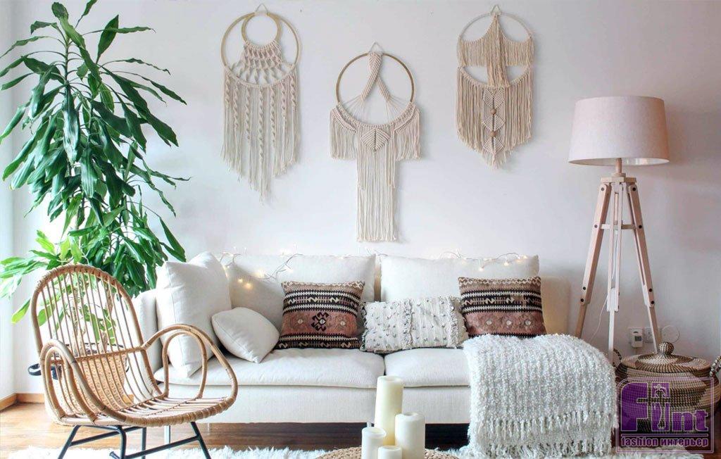 Уютный и стильный вариант оформления пустой белой стены — композиция из разных предметов, объединённых одним стилем. Это могут быть постеры, панно из макраме и другой настенный декор в духе бохо. Этот стиль отличается непосредственностью и естественностью. Он отлично подойдёт для того, чтобы создать модный, но не слишком яркий интерьер с натуральными и деликатными акцентами. Такой декор органично впишется в спальню или гостиную в спокойной цветовой гамме. Менять содержимое настенной «экспозиции» можно так часто, как вы того захотите, добавляя новые детали или заменяя их.