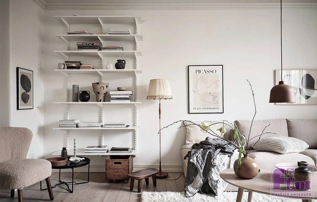 Убить сразу двух зайцев, обыграв белые стены и добавив им функциональности, можно с помощью декоративного хранения. Например, можно повесить над кроватью или диваном небольшие открытые полки, на которые вы поставите любимые книги, фотографии, милые сувениры или сезонный декор. Чтобы вся композиция выглядела завершённой, рядом можно повесить постер в тех же цветах, что и декор на полках.