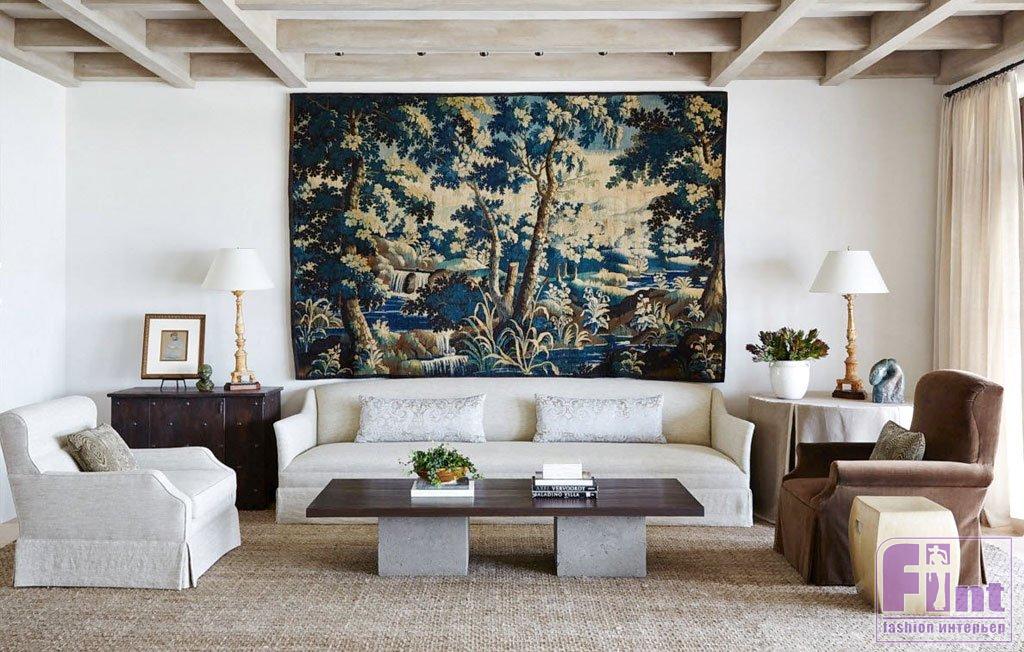 Более современный вариант ковра на стене, который так любили наши бабушки, — это гобелен или текстильное панно с яркой фактурой. Гобелен может замечательно украсить простые белые стены. Стиль изделия должен подходить общему оформлению комнаты: это могут быть скандинавские мотивы, этника, что-то винтажное или эклектичное. В таком случае однотонная поверхность заиграет новыми красками, как и весь интерьер.