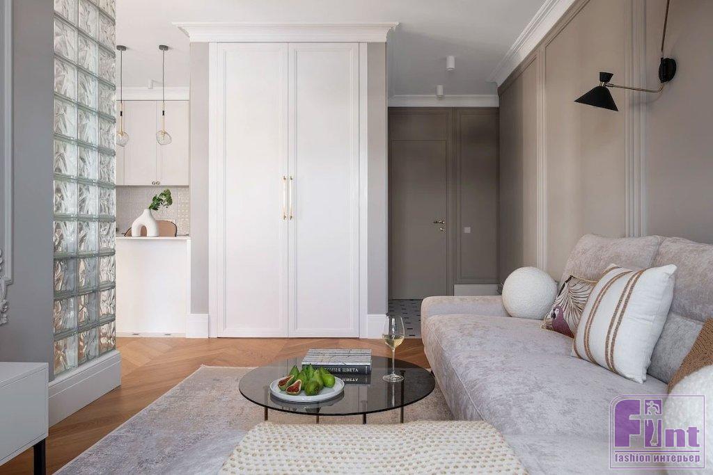 Хозяйка не будет жить здесь постоянно, и её основным запросом было малое количество габаритных шкафов. Дизайнер продумала необходимые системы хранения, но разместила их так, чтобы они не загромождали пространство. В спальне — шкаф для одежды. В прихожей за счёт перепланировки выделили маленькую гардеробную для верхней одежды, чемоданов, хозяйственных вещей. В зоне гостиной сделали нишу под шкаф со стиральной и сушильной машинами. Так как эта комната была кухней, и после перепланировки официально не может оформляться как жилая, стиральную машину здесь можно ставить. Кухня П-образная, компактная, но вместительная. От зоны столовой её отделяет небольшой полуостров. Встроена вся нужная техника, верхние шкафы доведены до потолка, чтобы увеличить объём хранения и визуально сгладить габаритную мебель.
