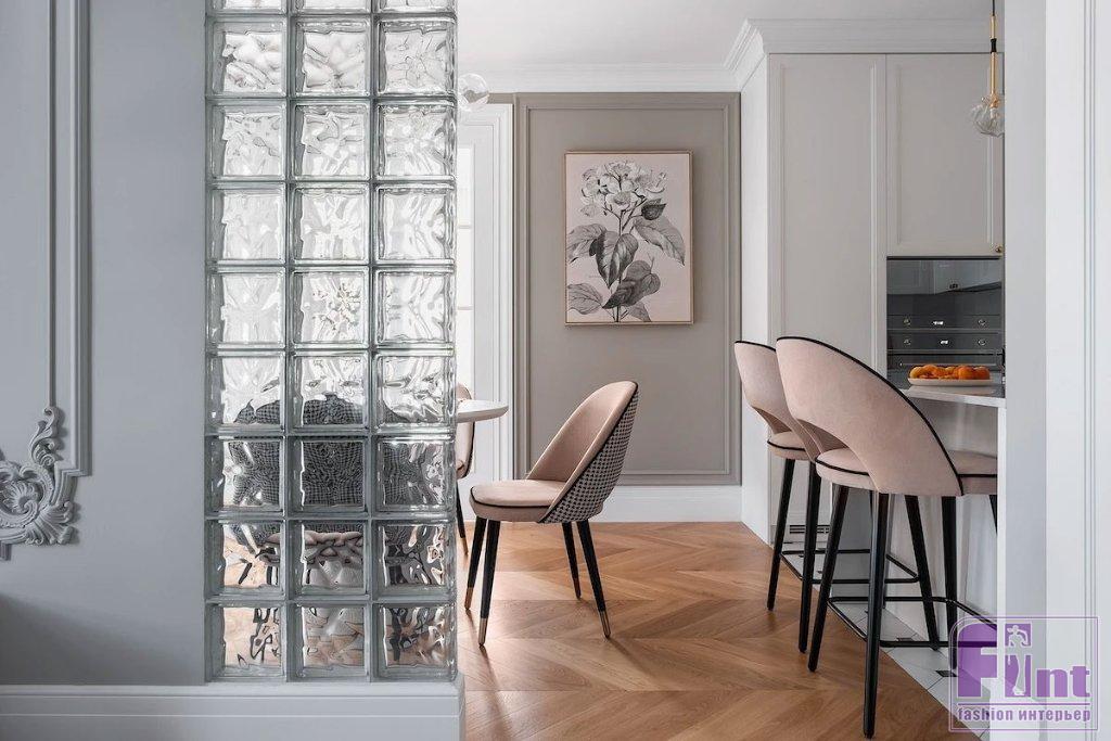 «Самым сложным в проекте было смонтировать стеклоблоки, чтобы они идеально вписались между полом и потолком. Сложность заключалась в том, что шов между блоками был предусмотрен в проекте 2 мм, а крестики под конкретно нашу модель стеклоблоков оказались только 5 мм, и мы не проходили по высоте. Строители использовали пластиковые подложки 2 мм вместо крестиков и металлическую арматуру для прочности конструкции. Выкладывали стеклоблоки по 3 ряда в день, чтобы клей успел схватиться, и наша конструкция не разрушилась. Швы затирали цементной затиркой в цвет стен», — дополняет свой рассказ о проекте Ирина.
