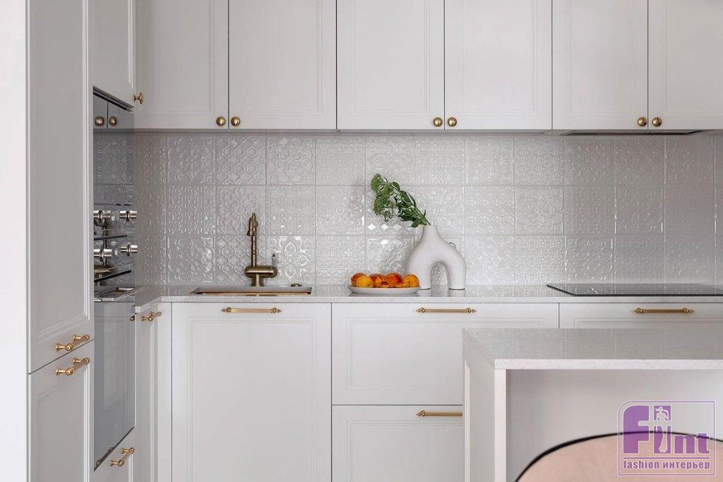 На полу уложена паркетная доска в раскладке французская ёлка. На кухне, в прихожей и на лоджии — мелкоформатная контрастная плитка под метлах (белая плитка с черными фрагментами). В ванной комнате стены оформлены керамогранитом под мрамор с элементами плиточного декора, который вторит стилистике настенной лепнины в комнатах. В выборе отделки продумали и такие мелочи, как дверные ручки. «Мы выбрали модель ручки с кристаллом Swarovski на рукоятке в форме песочных часов с очень красивой огранкой, которая даёт красивую игру света и бликов на солнце. Основа ручки выполнена в отделке из золота 24 карата. Эти ручки в интерьере, как дорогое ювелирное украшение на женщине, к которому хочется дотронуться и которым хочется любоваться. К тому же они располагаются в столовой зоне прямо напротив глаз, и любоваться ими большое удовольствие», — рассказывает Ирина.