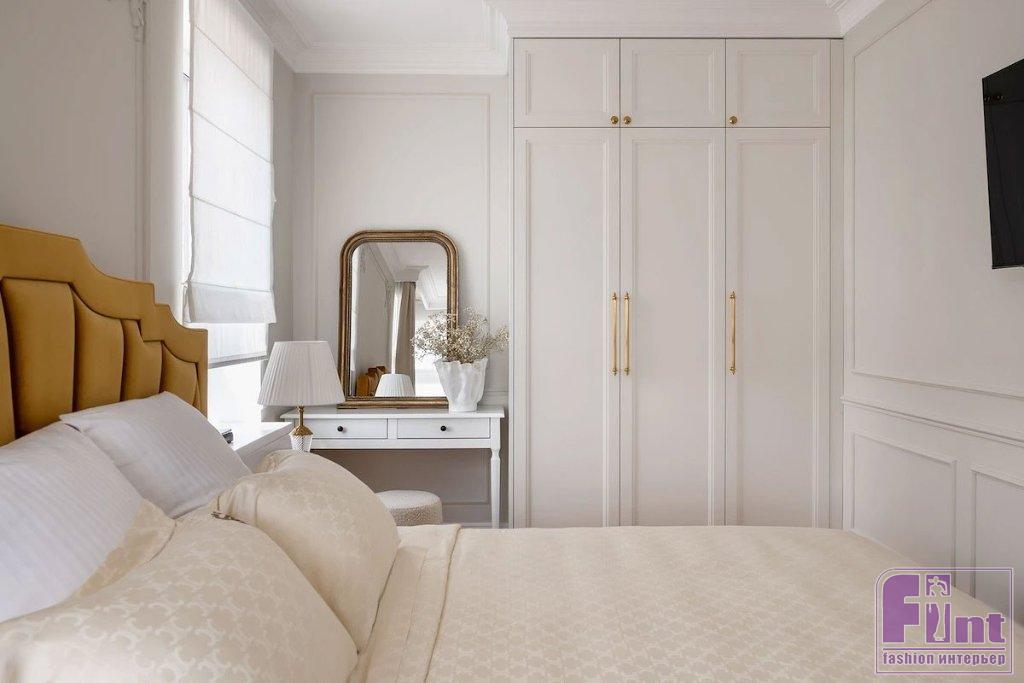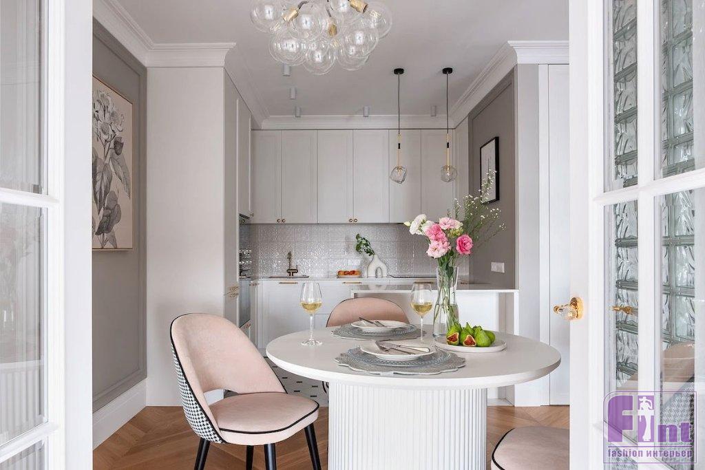 Следуя концепции, выбрали и отделку. Для стен — краска. Основа — белый и серый цвета. Общая зона окрашена оттенком под названием French Grey. Спальню сделали белой. Но оттенки сложные, они по-разному раскрываются под разным углом и светом. Архитектурный декор — неотъемлемая часть французского стиля. Стены и потолки этой квартиры украшают молдинги, лепнина, розетки.