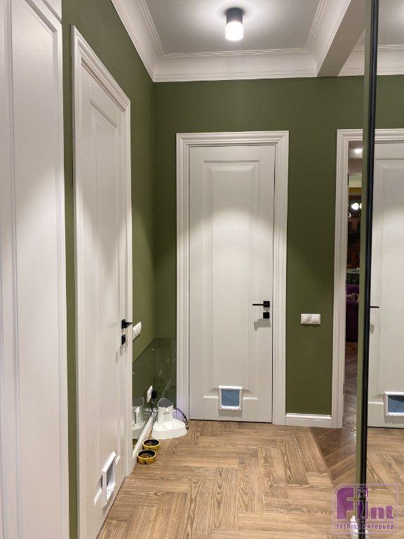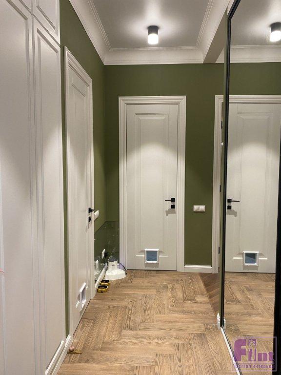 Основой для стен в коридоре стали практичные обои под покраску с песочной текстурой. Функциональные и стильные обои выглядят безупречно гладко, словно являясь частью поверхности. Эти обои под покраску легко монтируются и выдерживают многократные перекрашивания. Для окрашивания обоев в коридоре и стен спальни дизайнер выбрала шелковисто–матовую краску с выраженным эффектом сатина. Эта краска легко наносится и образует высокопрочное декоративное покрытие, устойчивое к влажному истиранию.