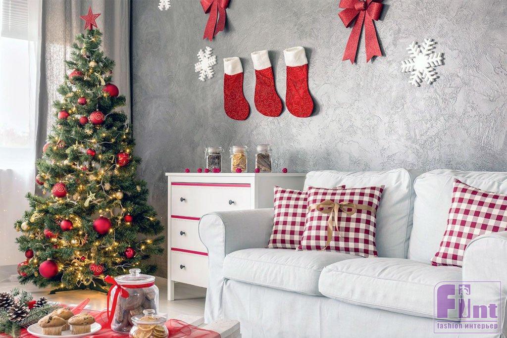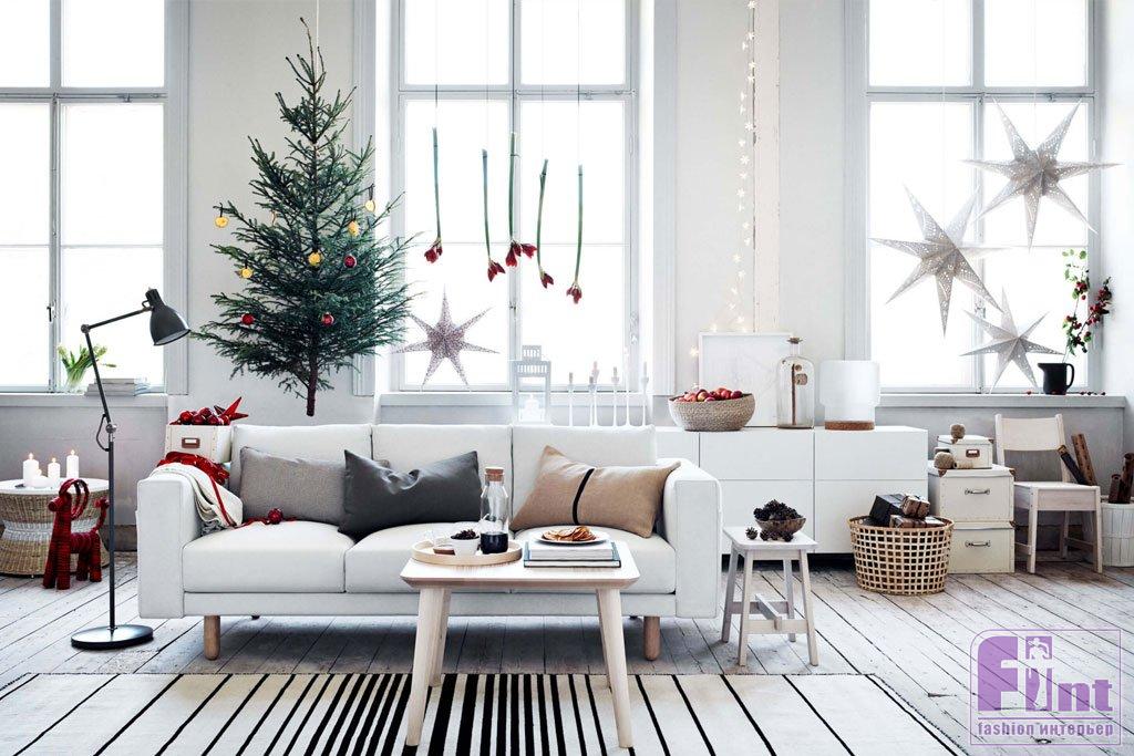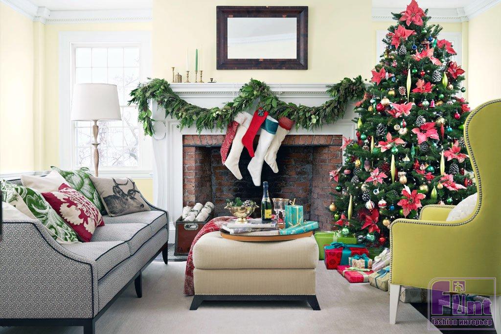Гостиная — главное помещение в доме. Здесь собираются все родственники и друзья, обмениваются подарками, смотрят рождественские фильмы и устраивают застолье 31 декабря. Декора в гостиной может быть много, ведь именно он создает атмосферу праздника.