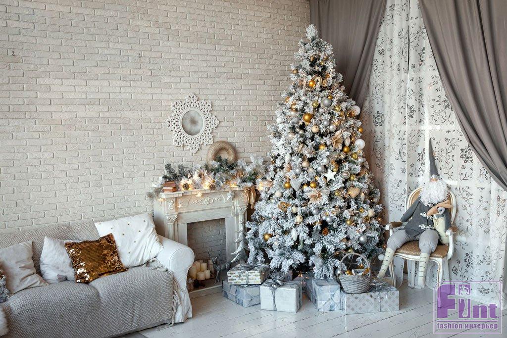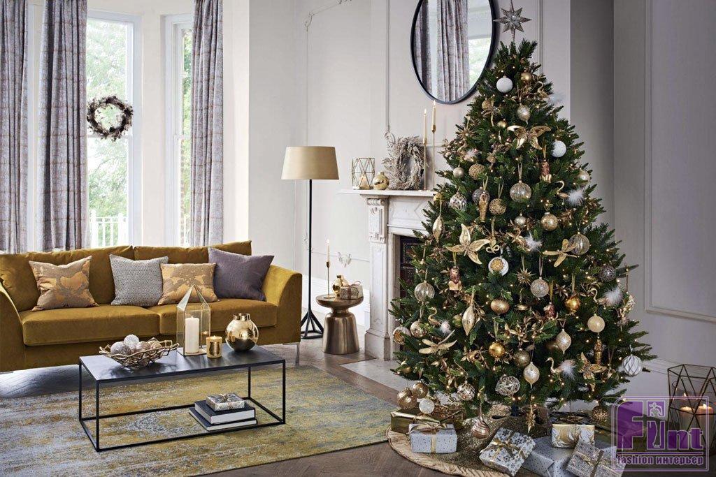 В центре внимания — ёлка. Нарядное дерево должно сразу притягивать взгляд, поэтому располагайте его на виду. Если комната просторная, поставьте ель прямо по центру. Если же места мало или помещение вытянутое, можно выделить для неё угол. Лучше всего, если он будет напротив входа.