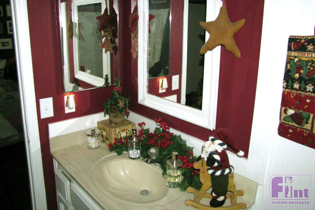 Оформляя квартиру к праздникам, санузел часто обделяют вниманием, поскольку это мокрая зона, да и места там немного. Но если вы хотите создать на 100% праздничную атмосферу во всём доме, то и ванную и весь санузел обязательно нужно украсить. Достаточно всего пары-тройки штрихов. Можно повесить на дверь мини-венок, поставить на полку или столешницу (если позволяет место) одну еловую веточку в маленькой вазе. Наконец, всегда можно использовать тематический текстиль: это и красиво, и практично.