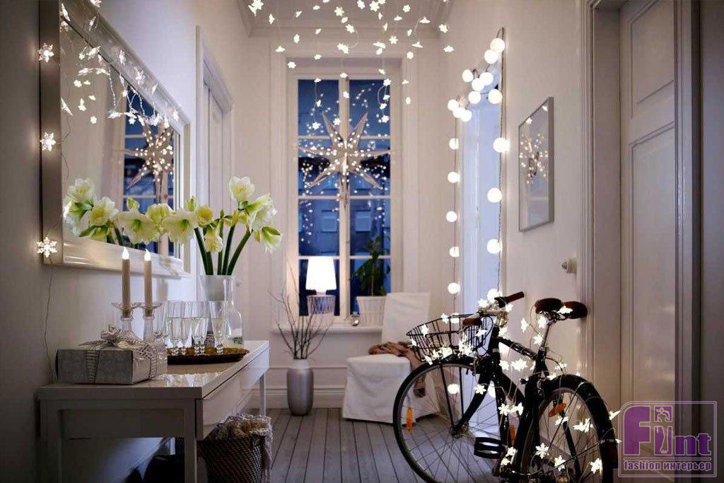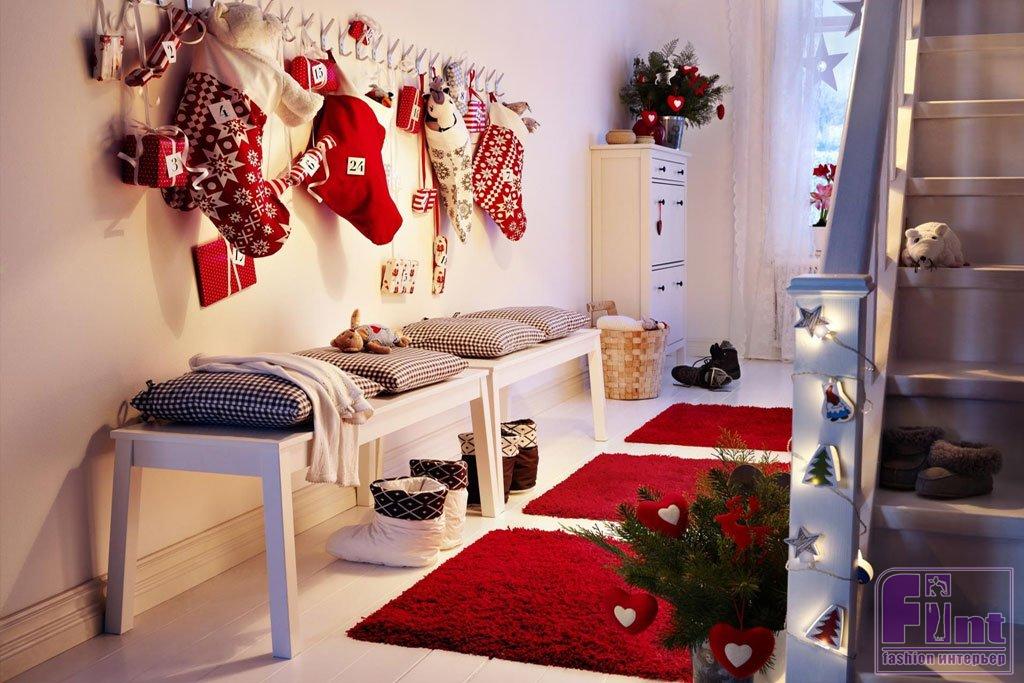 Оформление прихожей в праздничный период особенно важно, поскольку именно эту зону хозяева и гости видят первым делом — соответственно, уже здесь формируется настроение. Главный элемент прихожей — входная дверь. А классическое украшение для неё — рождественский венок. Его вешают как внутри, так и снаружи. Можно добавить пару колокольчиков или тематических наклеек.