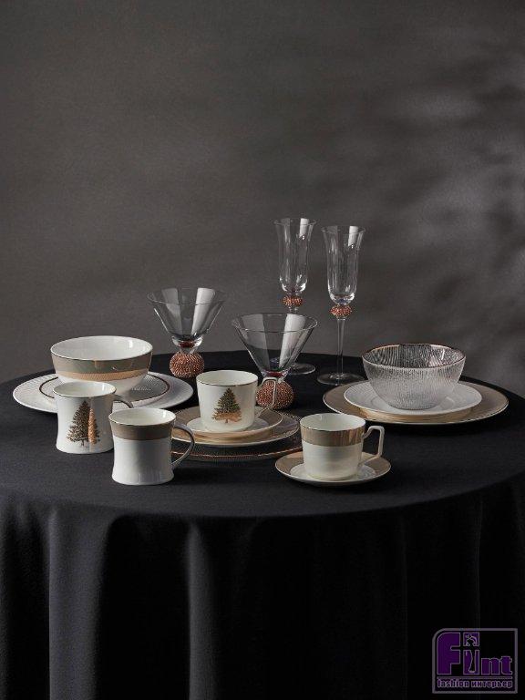 Вторая коллекция изготовлена из белоснежного фарфора и украшена золотым кантом и золотым декором в виде новогодних ёлочек. В компанию к тарелкам и чашкам идут бокалы-конусы с инкрустированной розовыми стразами круглой ножкой — вместе они создают образ «тихой», неброской роскоши на новогоднем столе.